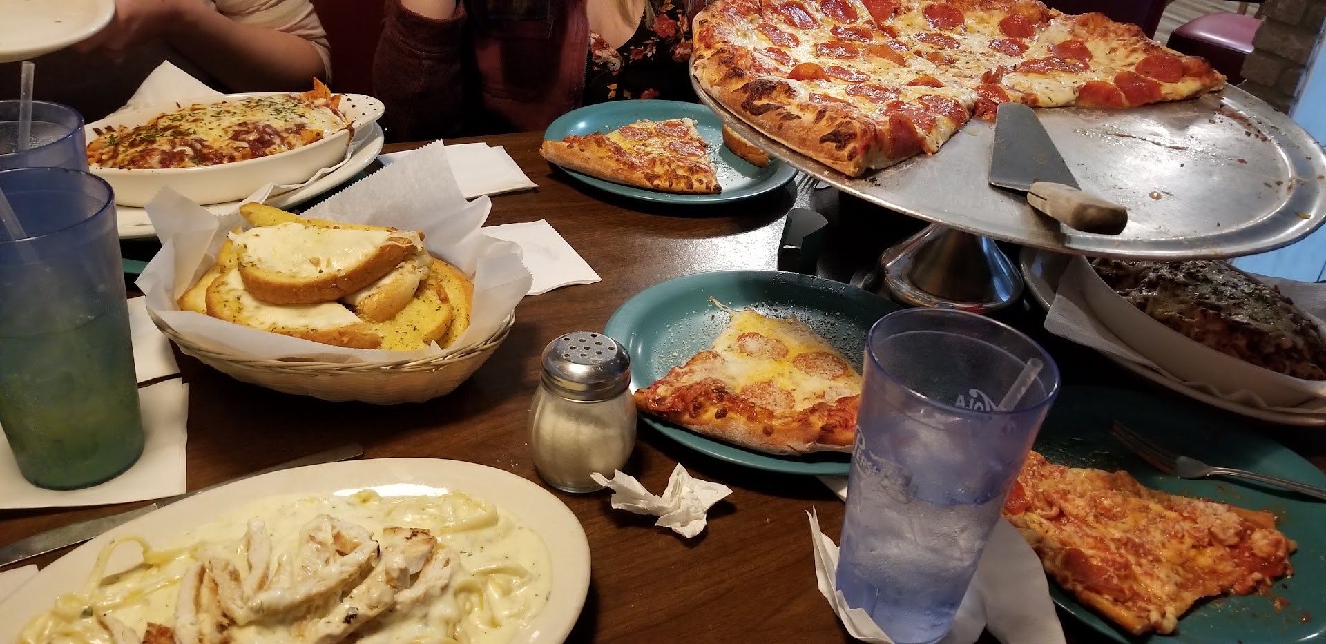 First we politely asked that our salads and our order of garlic knots to be brought out first before our meals were told of course no problem . The garlic knots were brought out with one side salad that looked poorly . We had to wait 10 mins or more for our large Greek and a dinner salad to come out. Didn’t get extra plates to eat the Greek salad on. Within a few minutes of receiving the other salads they bring out our entrees. We were not able to even eat the salad before our entrees came out. so needless to say we did not eat our salad and had a crowded table . The chicken parm that was ordered was burned and when asked if it could be refired was told that it couldn’t be cooked any less without it being raw in the middle . I informed them that if that was the case then I didn’t want it they said we wouldn’t be charged for it . Then we get the bill and we were discounted a couple dollars for the chicken only and charged for the pasta they did not take back to the kitchen .