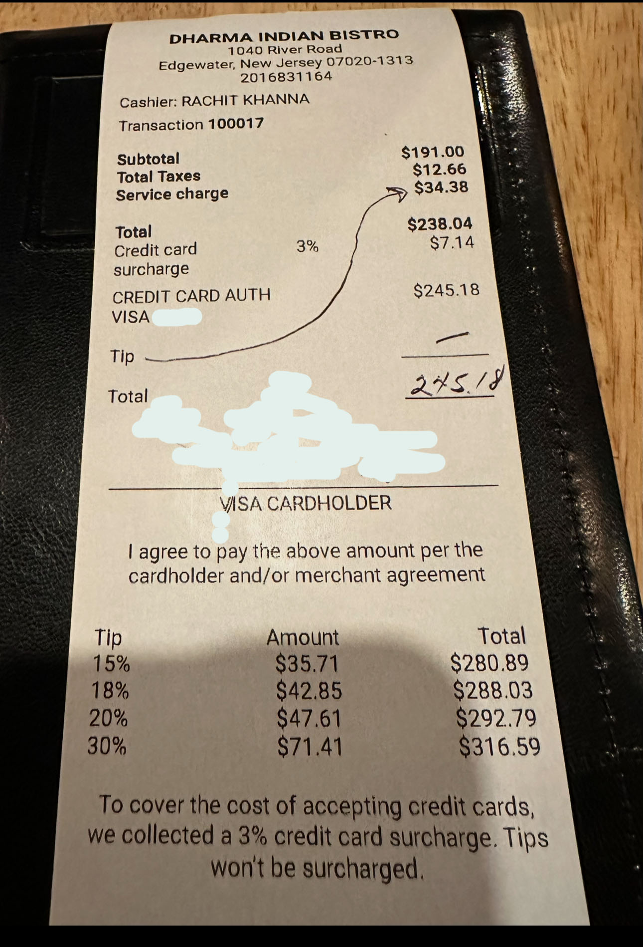 Recently, I had heard about a new Indian restaurant in the neighborhood: Dharma Indian Bistro, in Edgewater, and a group of 6 friends decided to give it a try this past Saturday, May 17, 2025. The restaurant is where the former Lobster Shack used to be and the space has been re-done with a modern and colorful décor that does look very appealing. The food, in general, was good, although, if I’m going to be objective, it’s not the best Indian food in the area. We tried 3 appetizers to share (2 orders of Samosa, 1 Surti Pakora and 1 Zucchini Onion Fritters) and they were pretty good. Some of our main dishes: Chicken Tikka Masala, Goan Shrimp Curry, Methi Macci and Awadh Ki Bhindi, were kind of a collective disappointment, as there was little of the protein or veggie in each dish and lots and lots of sauce. We also ordered one Tandoori Mixed Grill and one Patiala Murgh and they were OK. Judging by the “stale” look of both dishes, they seemed as if they have been cooked ahead of time and “sitting on” for a while. Being this establishment BYOB, we accompanied our dinner with wine. By the time we finished our entrees, the place was very busy and quite animated. Collectively, we decided to skip dessert and requested the check. When the waiter came back with it, I noted that it had a SERVICE CHARGE of 18% ADDED ($34.38 on a $191 food bill). Truthfully, I thought of it as no big deal, because we were a party of 6 and it’s known that many restaurants choose to add the tip to the bill for large parties. Seeing no disclosure as to any additional charges (anywhere on the menu or on the check presented to me) related to payment options, I decided to charge the tab ($238.04) to my credit card, instead of paying cash. My surprise (and discomfort) came when the waiter brought the new check with the credit card charge, which reflected an additional 3% CREDIT CARD SURCHAGE and an EMPTY space for TIP, on top of the 18% Service Charge already added. As it’s shown on the attached photos of the initial check and the one with the credit card charge on it, I indicated with a long arrow that the tip had already been established and charged by the restaurant. Had I been a little “out of it” (with the wine we drank, or distracted with our friendly conversation), perhaps I would have added one of the restaurant’s suggested tips at the bottom the receipt, which at the very least, would have meant leaving an insane total gratuity of $70.09 (Service Charge $34.38 + 15% Tip $35.71)on a $191 food bill! I WONDER HOW MANY OTHERS HAVE DONE IT! Considering this was my first and only visit to Dharma, I wonder if these questionable charges are part of their regular practice and, what’s more important, if other customers are aware that they may have been charged, as I was, without realizing it. It’s also important to establish that the restaurant provided me with one check to “add the tip” and sign, instead of 2 (one for the customer’s records), as it is customary in any reputable establishment. On my way out, I asked to talk to the manager and, surprisingly, our waiter presented himself as “the manager”. I explained “my issues” with all the charges described here and he offered an explanation that was neither candid, nor credible. Dharma, please take note that in New Jersey, restaurants MUST disclose the service charge to customers BEFORE it's added to the bill, usually through a notice posted at the point of entry and/or at the...