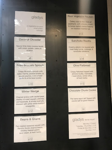 Read more(Updated 7/25/25) I have been coming to Gladys for years at their stall on the other side of Edgewater Public Market, but it feels like with the move into the former Meta Burger space (RIP), they have perfected their concept. The seasonally-changing menu provides combinations of flavors you will simply not experience elsewhere in Denver. I'm always blown away any time I try a new dish, often coming away thinking it is my new favorite thing. With the change in spaces, they've doubled the menu size, introducing several new delicious items like the Greg Burger, but after seeing what this team has been doing in terms of presentation in takeout containers for years, it's great to see it all finally come together on ceramic plates. I love how nearly everything on the menu makes a vegetable or legume the centerpiece of a dish rather than using meat substitutes, and that their menu relies so heavily on locally produced Colorado produce.
