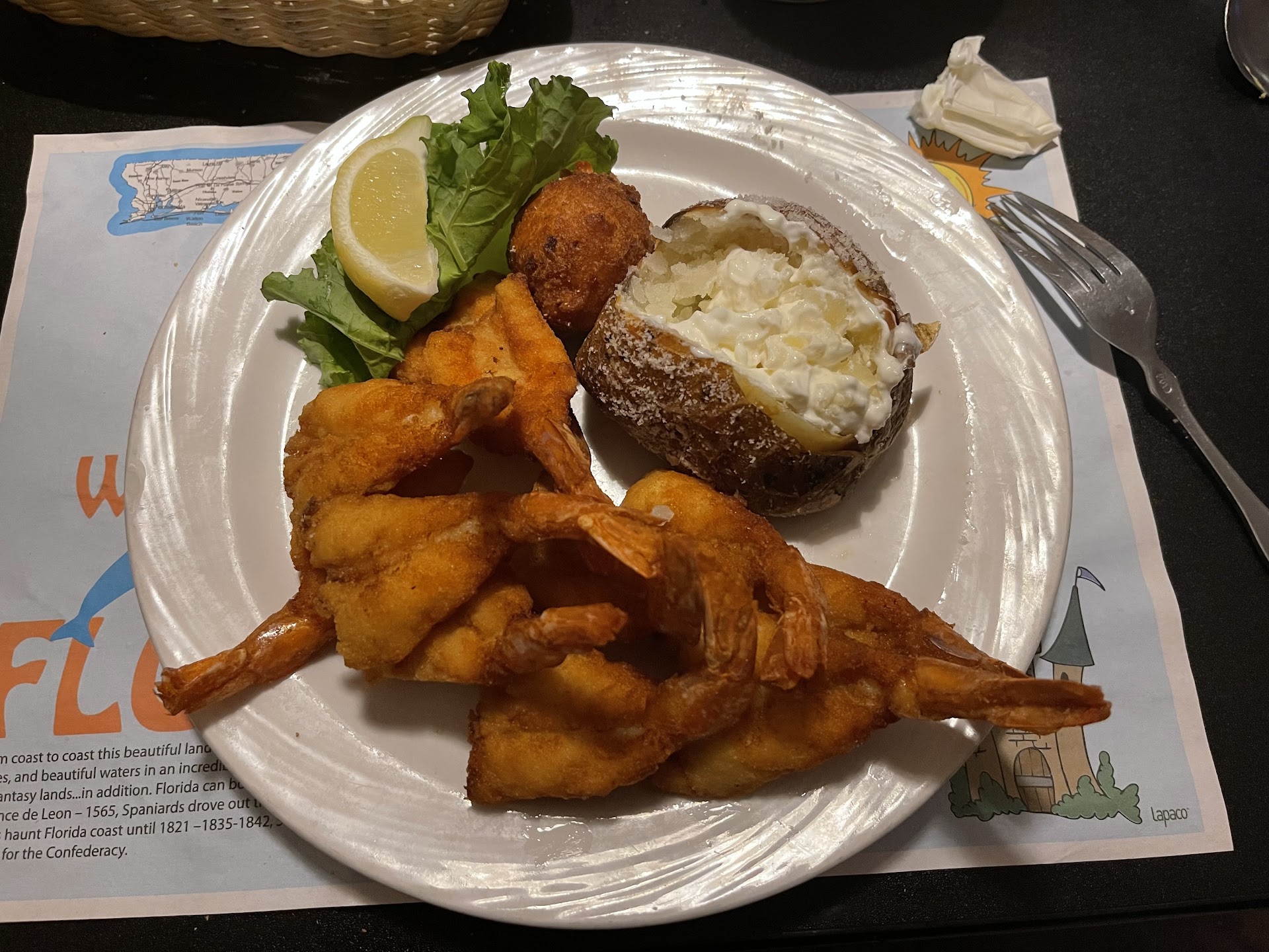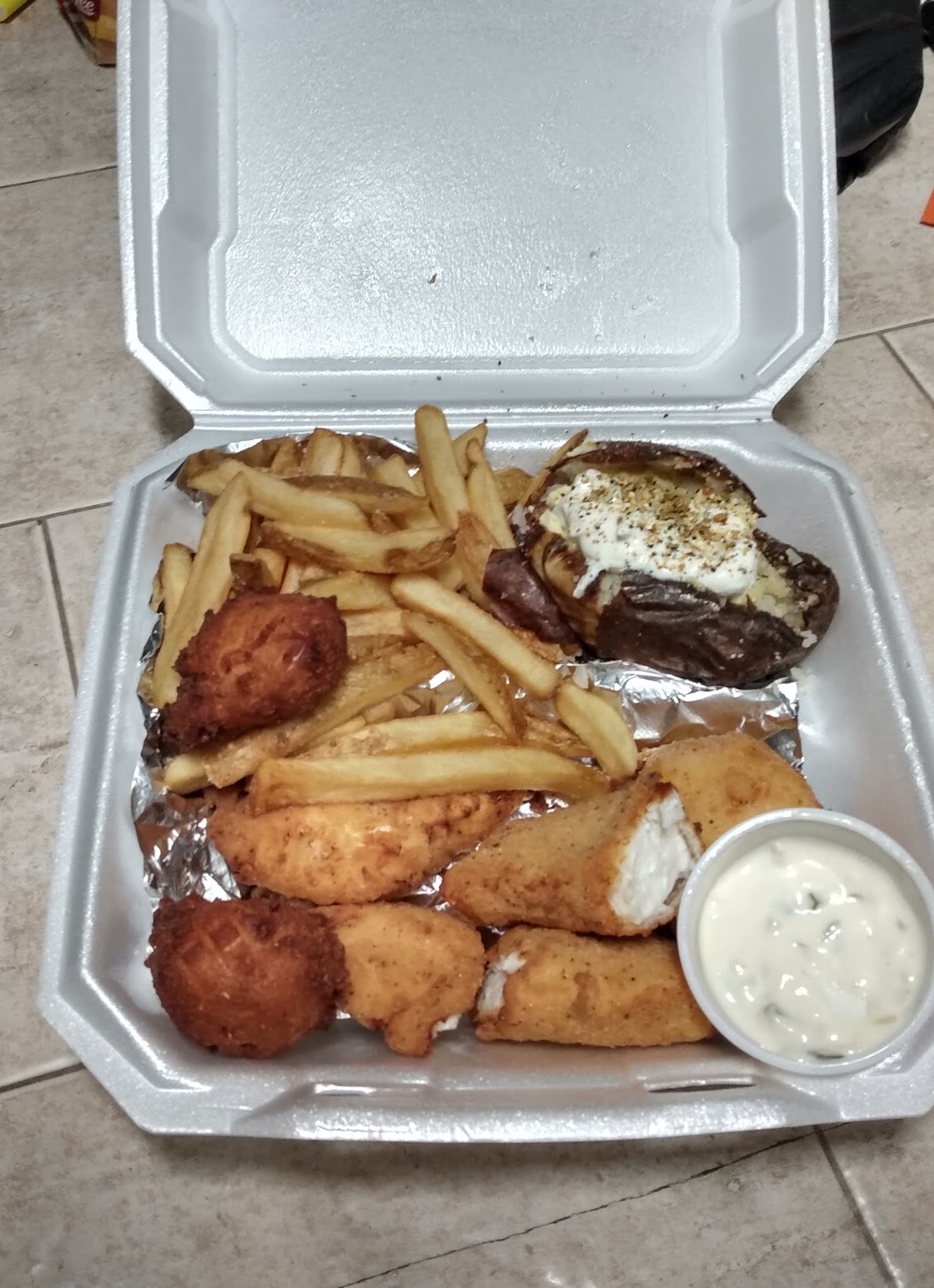 Fish N Chips? It’s not on the online menu , so I called and ask about it , She said all fried fish is the same and It comes with two sides such as Homemade Fires , Baked Potato , Rice , or Vegetables. The homemade fries sounded good , and so did Halibut. For the second side how about we go with a baked potato. She took my order and said it would be about 20 minutes. I never did find out how much.. but it’s the same as the other fired fish right?