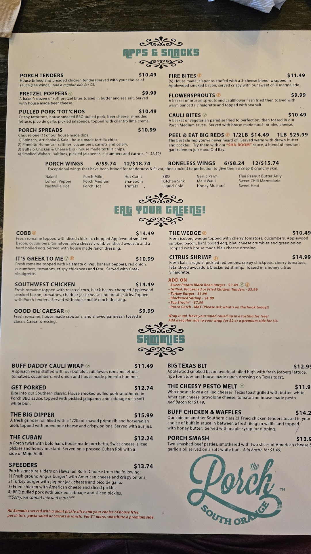 Ā Ā Ā Read moreI went to The Porch last Sunday around noon for Brunch with a few friends. My friends and I were very excited to try this location out since we've never been to The Porch before and have heard a lot of good things about the Winter Garden location from other friends. The service was ok. Our server was friendly. I did not like the layout of their Brunch menu. The menu was confusing. You couldn't tell what was an appetizer, salad, entree, or sandwich. I ordered the County Fried Chicken and a side of the Smashed Potatoes. My friends ordered the Nashville Hot Chicken & Biscuit, The Cuban, and the Hash Skillet. We all tried a little bit of each other's food and were very disappointed. Everyone's food was very underwhelming and lacked flavor. My meal was disappointing. I was expecting a whole piece of country fried chicken instead I received 2 little tenders ontop of the biscuits with gravy on them and 2 eggs. The biscuits were very dry and felt like I could've choked on it if it weren't for the gravy on them. The eggs were good though.Ā The Smashed Potatoes š„ were not what they were described. They were just full boiled potatoes with no flavor. How can you mess up potatoes out of all food items? The Hash Skillet š³ portion size was pathetic for the price. We've could've gone to Waffle House of all places and gotten a larger portion of hashbrowns with all the same things in it for half the price. The chicken from the Nashville Hot Chicken & Biscuits š„š was bland, flavorless, and not hot at all. You're better off going to Chicken Fire for better spicy chicken. The Cuban šØšŗ was not a Cuban at all. I'm Cuban and I wouldn't have eaten that.