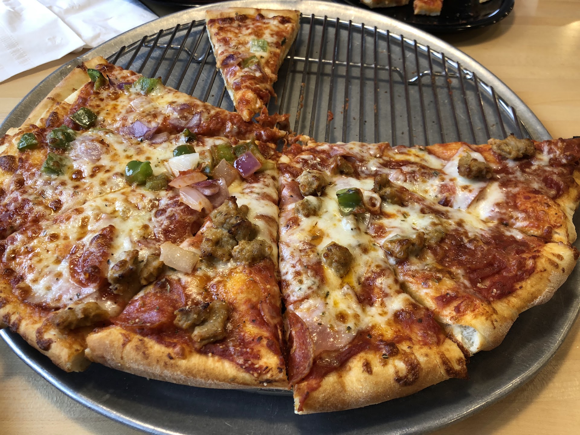 Customer for 30 years. Product quality is decreasing and may explain increased discount marketing. Ordered online in advance through an email coupon. Picked up food and ate it there. Safari browsing experience online is inferior to other regional players (e.g. Carbones). National apps/browsers far superior. Of course, actual pizza is junk compared to you and other local/regionals. Poor browsing when selecting special. Ordered 5 meat and removed bacon and hamburger and added onions and green peppers. All right side of pizza. Double checked because kids only wanted cheese. Meat came on one side and veggies on other. Store receipt and email receipt doesn’t delineate left/right and only provides “half” this and half that. So impossible to tell. Entered gift card and credit card and site charged credit card full total and didn’t take off $25 gift card. Nice staff member at restaurant adjusted. Staff provided cheese bread and drinks ahead of pizza so attentive. Restaurant clean and gives off comfort, warmth feel Staff brought pizza to table in box and returned it in pan so we could eat there so thoughtful and attentive Pizza showed up wrong as described above. This is part for the low rating. However, major reason for low rating is the pizza had nothing on it. Cheese not covered end to end with sauce showing and few toppings (traditional crust). Had 3 & 6 year old so wasn’t going to ask for a redo. Plus receipts couldn’t pinpoint source if problem. Eat and run.