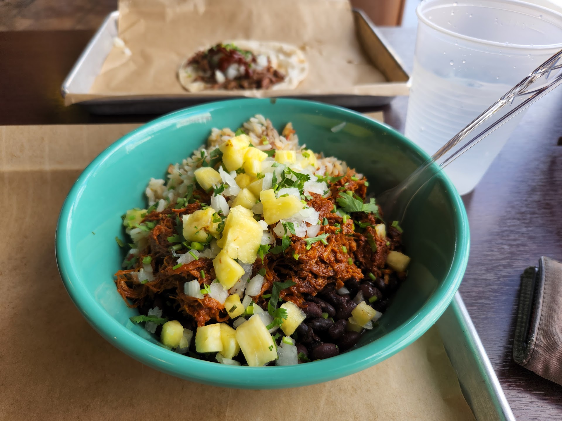 Read moreIt was 3pm and I had not eaten breakfast or lunch....so my appetite was through the roof. I felt like anything would've tasted amazing at that point because I was so hungry. My buddy and I wanted to try something new, so we chose this spot. All I can say is that this place was a huge disappointment. Menu was boring and very limited. I chose an Al Pastor bowl for $10.50 and I'd say the portion is about 80% of what you typically get at Chipotle (for a bowl), and my buddy chose a $4 Barbacoa street taco. The Al Pastor meat was very good and fresh, but the rice, beans, and the salsa I put on it was very bland/boring. In fact, I'm 90% sure the rice wasn't flavored at all because I couldn't taste anything when I ate the rice alone. The salsa appears homemade, but it was also very dull/boring - lacks any zest or tang. The street taco was also way overpriced for $4 because my buddy literally ate it in 2 bites. Other local joints I've been to that offers street taco's charges only ~$3 for a street taco and it comes with a small...