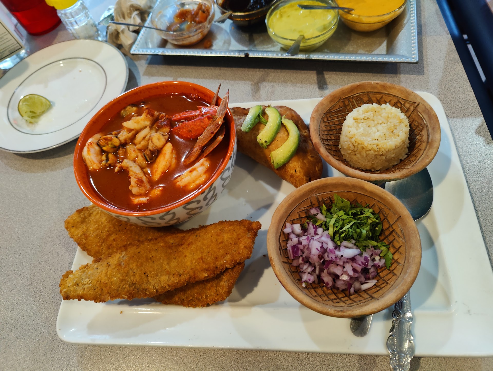 Read moreGreat tasting Mexican seafood! There are a lot of food choices on the menu but I went with the Combo #04 (1 bowl of fish/shrimp caldo, 3 pc fried fish, 1 ceviche chalupa, and rice). This is a very filling combo and so very tasty! I don't like that the rice is very little but I asked for some more to put into my caldo and the waiter (Angel) gladly brought me another bowl. He's awesome by the way. I also ordered the Ceviche chalupas (3, but so large that they give you another tostada to make a 4th!) and it was very well served once again. Do NOT hesitate to make your way here. Great food, Great service, and just an overall GREAT...