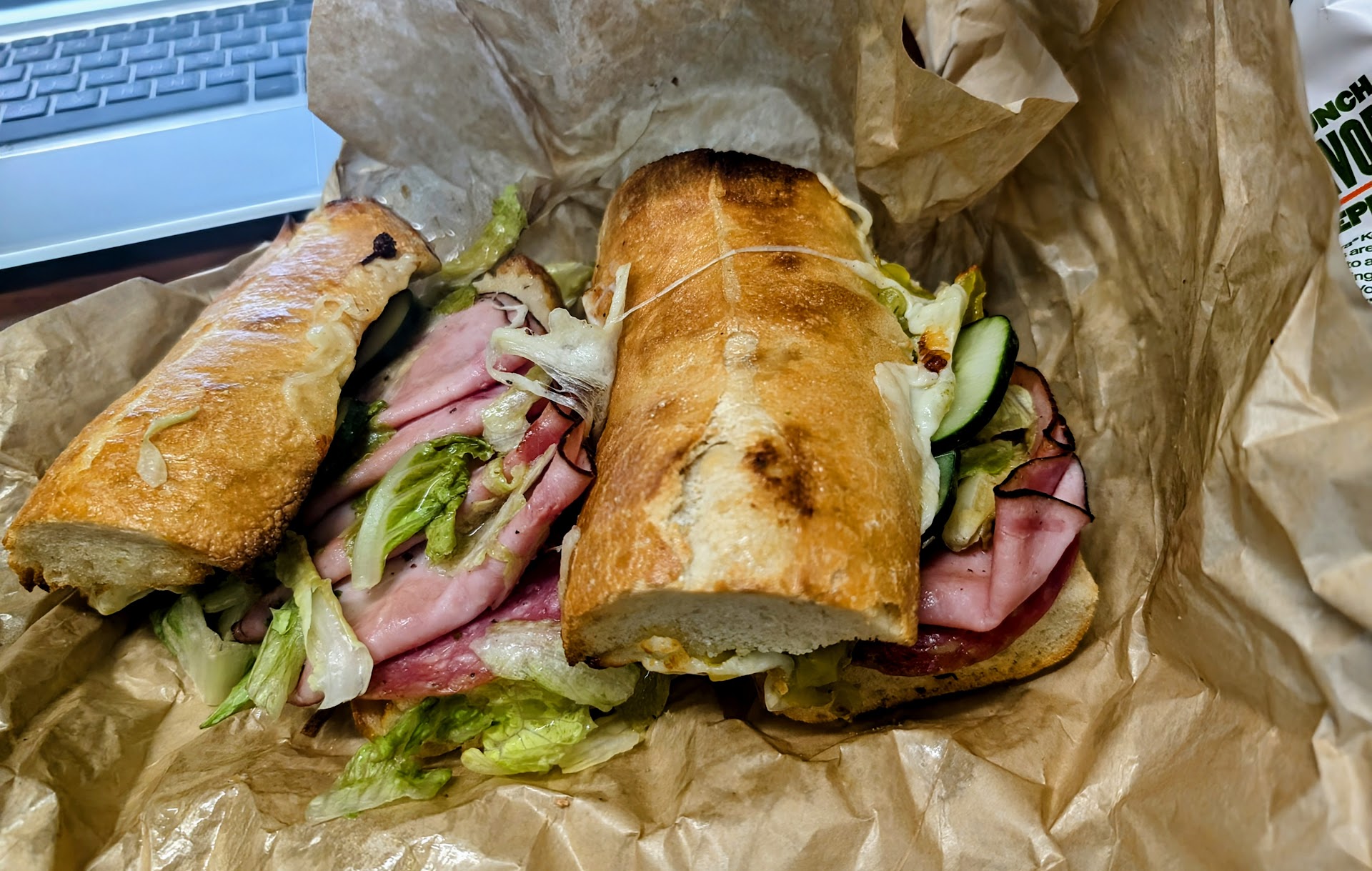 That was first. Their slogan of "waiting is the hardest part" is a joke. I can live with the 1 hour wait IF...the sandwich and soup were worth it. Well check the pic of my sandwich. It was almost falling apart inside the bag. Do they not know how to wrap a sandwich? Subway does better wraps. The bread was hard....the cuts were semi bland. The dressing on the sandwich was barely distinguishable and didn't add any pop or flavor. It only made the bread a little wet...that was it. The bread was so hard that as you bit down into the sandwich, the fillings would just slide out. Such a waste of a sandwich...and more so of my time. 1 hour for this?