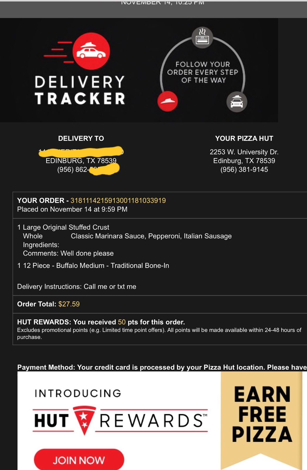 Read moreFood was delivered fast but the quality is not as great as the other Edinburg locations. Iâm peeved that I cannot choose the other University/Sugar Rd location. If you try calling either location you will be transferred to a call center. I had to place an order online and only to find that Parmesan cheese & red crushed pepper has to be specified in âspecial directionsâ box. Thatâs like getting a burger combo and being charged extra for ketchup for your fries. I was on the phone for 52 minutes with no resolve. Iâd rather deal with another pizza restaurants in...