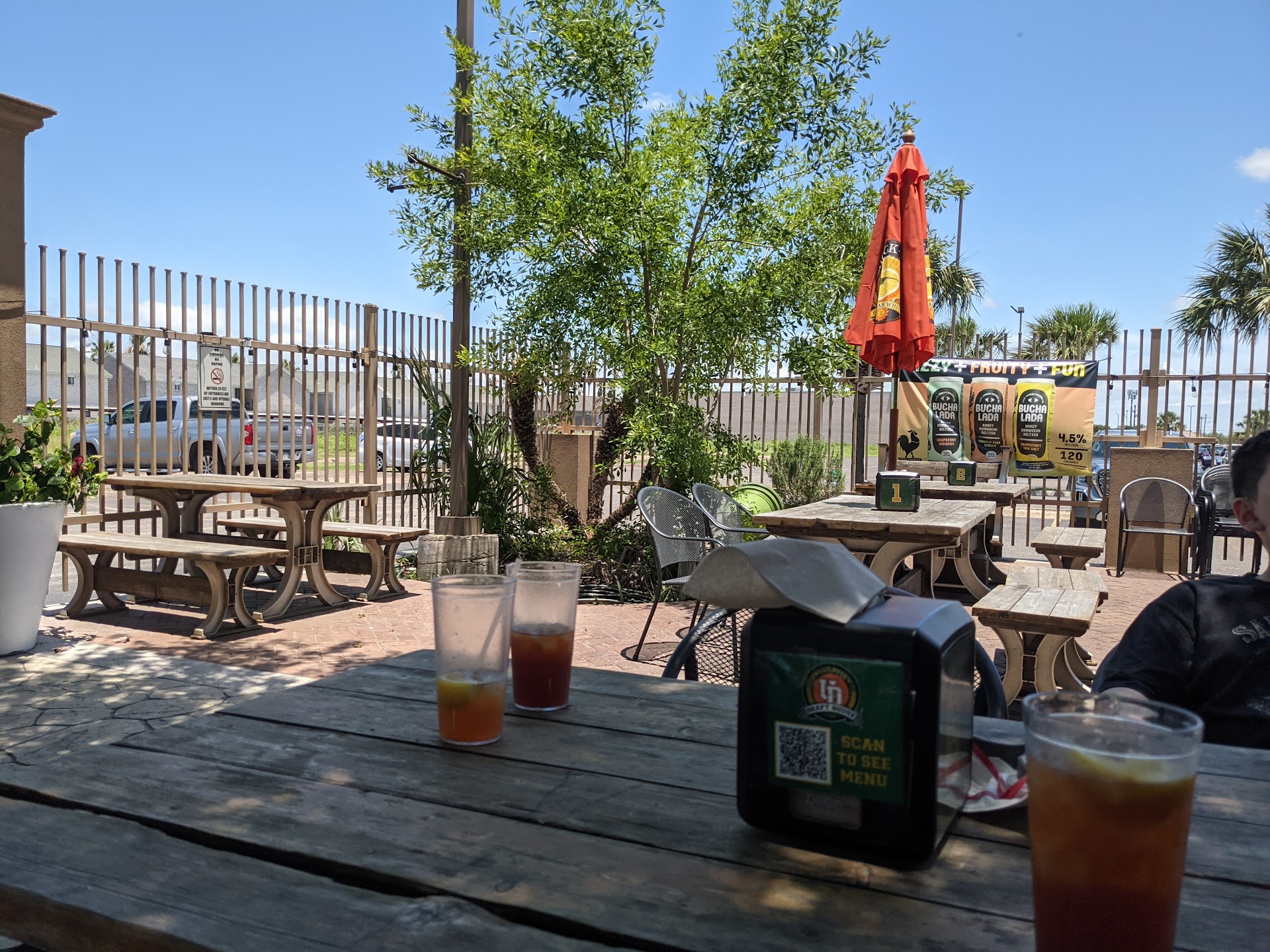 I went to the University Drafthouse House with my son and long time friend Eddy Cavazos. The place is just east of McColl Rd. In Edinburg. Walking in I immediately noticed the all the big screens located inside, perfect for watching any sporting event. Since it was such a nice day we decided to sit outside. Our server took our drink and appetizer order, we ordered the Calamari and fried Mushrooms to start with. Our server brought our teas and shortly after our appetizers. The Calamari was cooked perfectly, it was served coated with a sweet chili sauce. The Mushrooms were also prepared on point, dusted with parmesan cheese, and served with a traditional ranch dressing. I really liked that they were good sized mushrooms, however, a nice marinara to dip into would have really taken them over the top. My son ordered the burger 101 a basic burger, he likes it plain and dry, comes with fries, he really enjoyed it. I ordered the Greek lamb burger with a side of onion rings. The burger comes with tzatziki sauce, feta, red onions, and arugula. The menu stated it comes with roasted tomatoes, but as you can see in the photo there were none present. Also, there was very little feta, but my server brought more upon request. I was disappointed that the pattie itself was dry I was hoping for a juicy concoction,and it could have used some salt to enhance the flavor. I do have to say, those were the best battered onion rings I've had in a long time. My only real complaint was the food was not as hot as I like, my guess is it sat in the pick up window to long due to the lull between appetizers plates being picked up to burgers being served. Eddy ordered the fried Shrimp appetizer for his meal. They were large shrimp served atop slaw and jicama slices. He gave me one, outstanding!! Light batter, crispy real good. Lastly we ordered the brownie to share, served warm with fresh berries, chocolate sauce,and ice cream. The menu stated it would be served with candied pecans, Again, NO PECANS!! Eddy commented Walnuts in the brownies would have been nice, I told him the Pecans would have done the texture effect it needed had they been served. Overall I give them a single thumbs up and deduct stars because of the flies that started pestering us so bad that we had to change tables, and the missing menu items. I do recommend you give them a try, I'll be going back for the O- rings, plus I'll be reviewing the new location in...