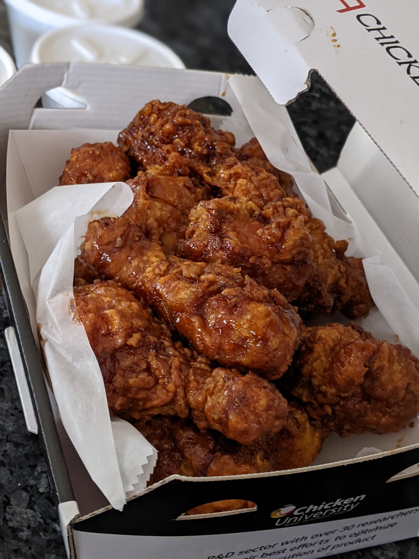 The one sincere complaint I do have, and the reason for the low "service" rating and the missing fifth star overall, is this: They don't label their food. I often order as part of a group (lunch at work) so we'll order several different varieties, and every time we have to spend several minutes figuring out whose chicken is whose. Sure, some of them are obvious but a lot of them are not; I challenge anyone to discern between Secret Spicy, Hot Spicy, and Spicy Galbi based on sight and smell alone. To me, this just reeks of laziness on behalf of the restaurant. Literally all they need to do is keep a permanent marker next to the packing station and write the contents on each box. If every other restaurant can do this, why can't they? Once they start marking the boxes with the contents I'll happily bump this to five stars, but...
