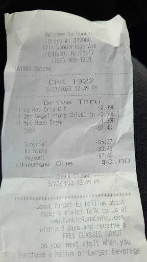 Read moreBUYER BEWARE at the DRIVE THRU!!!! As you can see on the RECEIPT I bought a large coffee and food and within seconds my hand was BURNED and truck was filled with coffee that SPILLED because the INCOMPETENT attendant DIDNT SEAL the coffee cap on the cup correctly.My console was COMPLETELY DRENCHED with coffee and they DIDNT even offer towels to clean it. I had to ask. They gave me a cup of ice for my hand. It was fine. Nothing major. What was INSULTING is the fact that they wouldn't even COMP me for my troubles. As you see on the receipt I was given a CHOICE. Refund or be on my way. I asked for compensation for my troubles and they couldn't EVEN ACCOMMODATE the situation. When I asked for compensation just for the order another lady came and the guy (who was probably the manager) WITH A BAD SALT AND PEPPER CURLY HAIRCUT FROM THE EIGHTIES decided to get involved all of a sudden. I wasn't asking for much but if I could give NEGATIVE 0 STARS I WOULD. BAD EXPERIENCE and WILL NOT be going back there and I suggest future customers make sure your coffee cups are...
