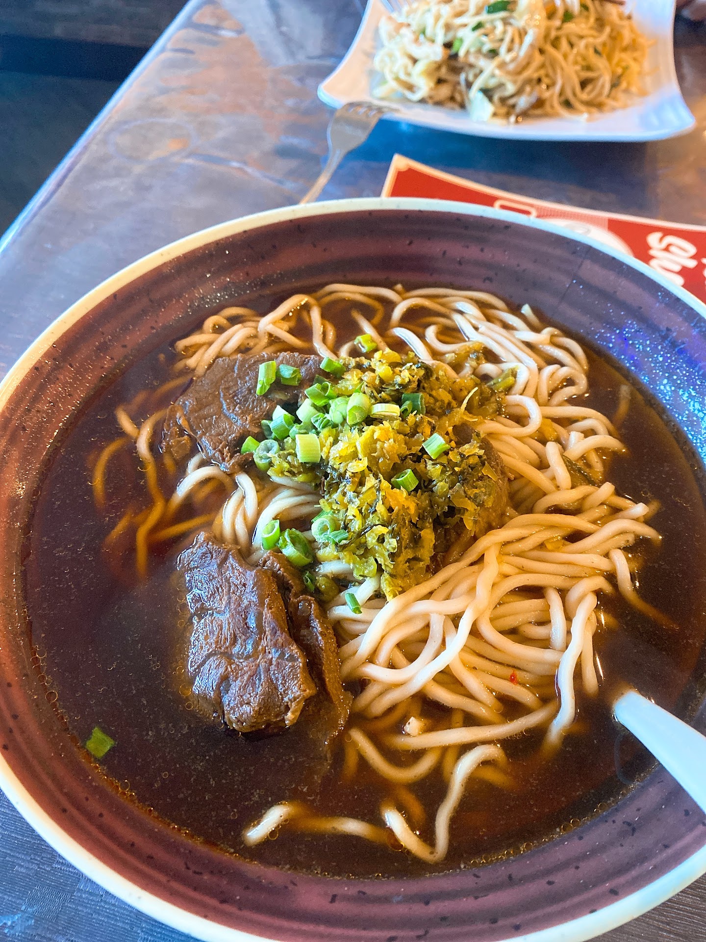 Read moreThis place was absolutely delicious, I went around 1 in the afternoon and was shown a table immediately. Great service, took my order promptly, answered any questions I had about the menu, food came out quickly, came around with tea, nothing bad to say. Be prepared to hang out and eat slowly, you're meant to talk and drink tea. The food itself was outstanding! The beef noodle soup was exceptional: a strongly beefy broth with warm spices, toothsome noodles, and tender pieces of beef, this style of soup is delicious. The braised pork over rice was just the right amount of tender and fatty, and the pickled greens that came on the bowl really tied the whole dish together. My brother's mapo tofu was the best I've ever had, perfectly balanced between spice, richness, sweet, sour, and just enough pork to give flavor without overpowering the tofu. We also had the cold beef tendon as an appetizer and it may have been my favorite thing we got as it was perfectly tender while still being subtle in flavor. Fair prices with good portions, I cannot really think of a way to make this meal better. I highly...