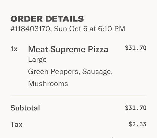 Read moreI ordered pizza from Franco’s Pizza on 10/6/24 through the SLICE app and had a very disappointing experience. This was my fourth time ordering from this place. I ordered the SUPREME PIZZA and specifically requested sausage, mushrooms, and green peppers as toppings.