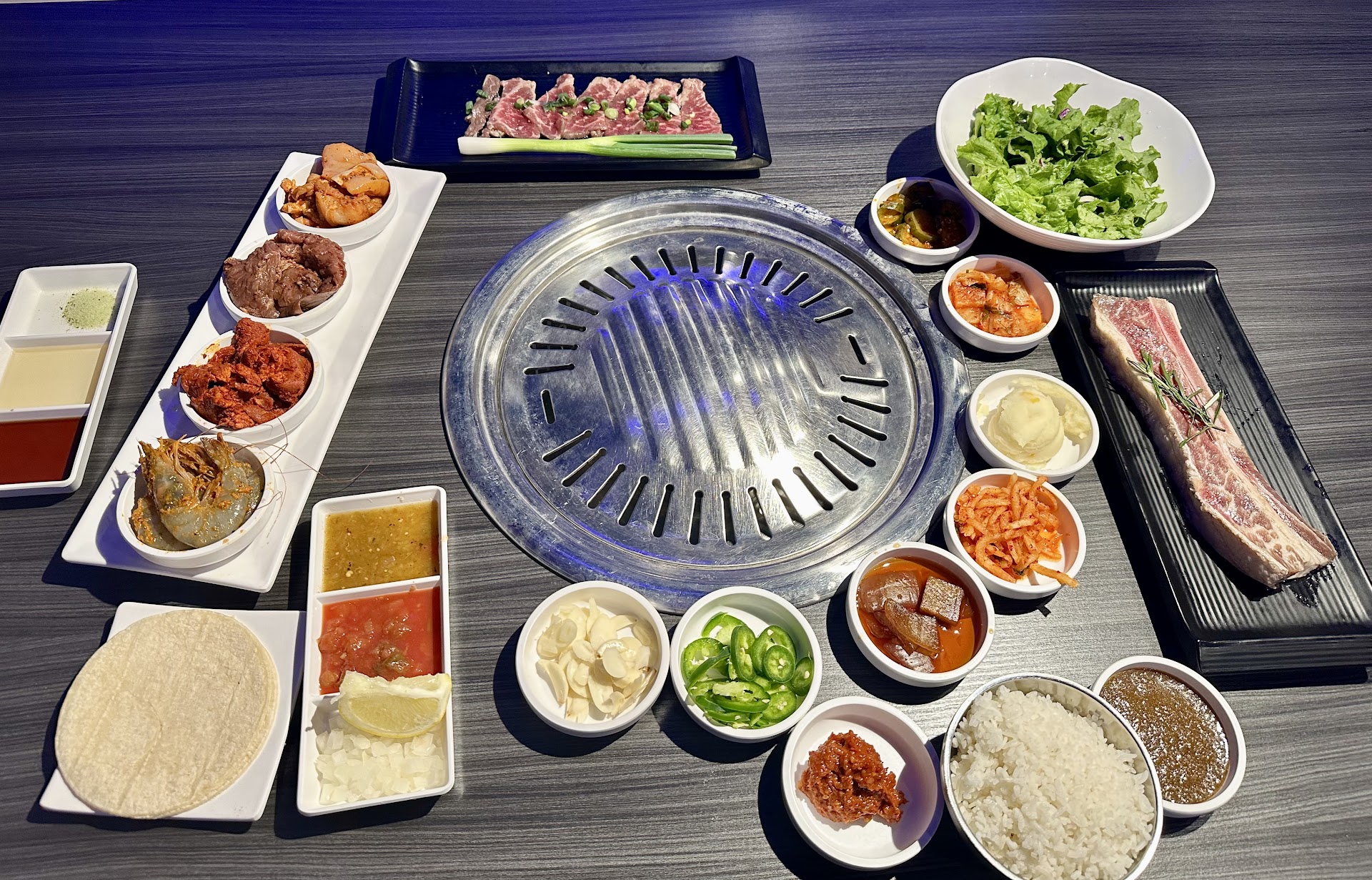 • Premium Marinated Long Bone Short Rib Steak • Premium Marbling Center Cut Marinated Short Rib (limited to two orders per person — make sure to get it!) • Premium Wagyu, buttery and incredibly tender • Premium Cajun Shrimp, packed with flavor • Al Pastor and Carne Asada, both well-seasoned and delicious • And the Premium Taco Sampler, which comes with Carne Asada, Al Pastor, Pollo Asado, and Cajun Shrimp, plus unlimited tortillas to build your own tacos at the table.