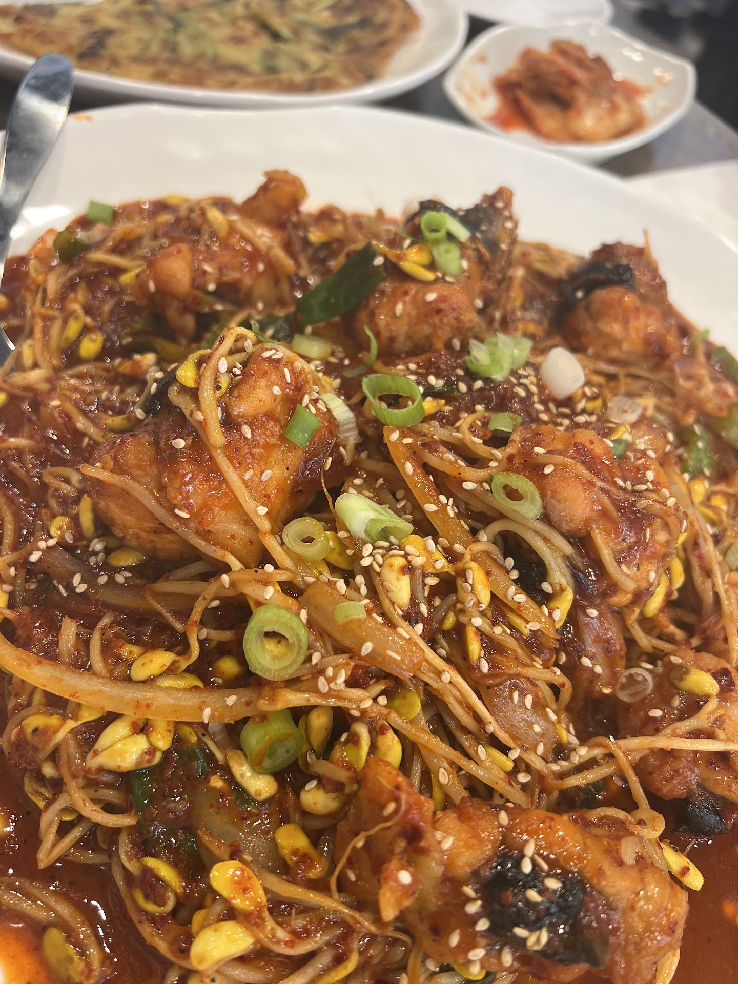 My husband and I ordered seafood pancake and agujim, which is monkfish braised with lots of bean sprouts. Itโs very spicy so if youโre in the mood for some heat, I highly recommend this dish. Itโs more than enough for two people. My kids are usually picky and the staff was so accommodating to omitting green onions and bunch of other stuff in their udon soup and their rice cake soup. My 2 yr old son ended up eating 2 whole bowls of rice with his food!