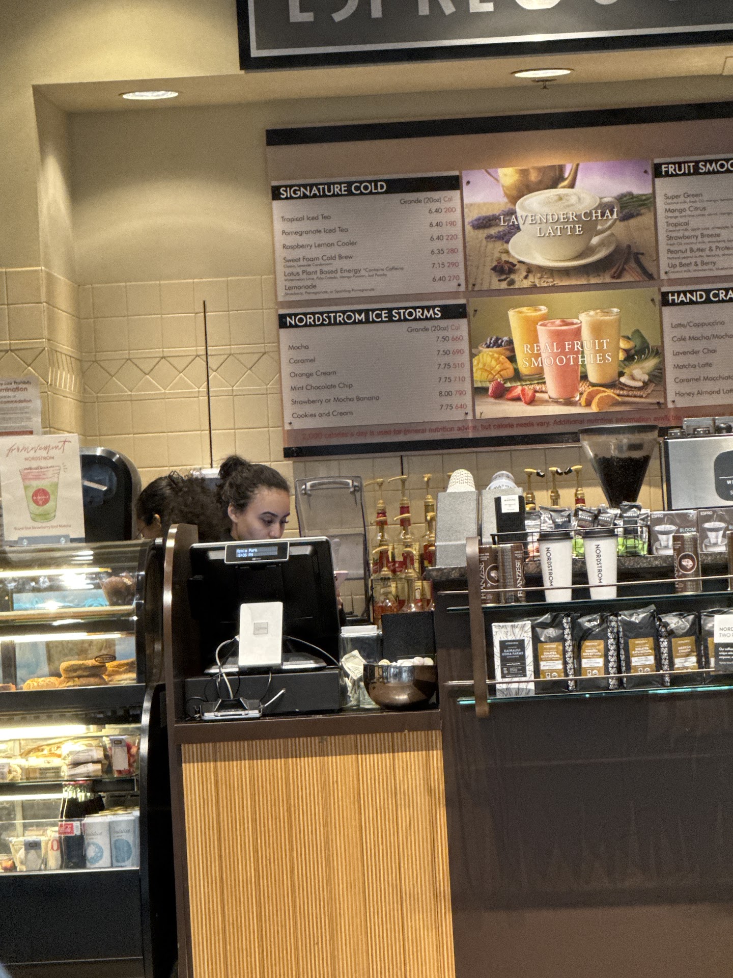 When I visit NJ and don’t have my Peet’s Nordstrom Coffee is the closet to Peet’s I’m gonna get. I love you girls working there and you always make my coffee amazing. Some better than others. Joselyn is always on point. However tonight on my 2nd coffee. $17. I caught a little attitude I am not sure why. I didn’t have small bills to tip. Perhaps that was the reason because I always tip. But along with the attitude I got a coffee that wasn’t as perfecto as the one I had an hour before. I am very kind to you guys there’s no reason for attitude. Still love you all though we all have bad days, but as a former mixologist, I left that shhhh at home and always served the best with a smile. But I am also from the older generation where you would get fired for an attitude complaint. So...