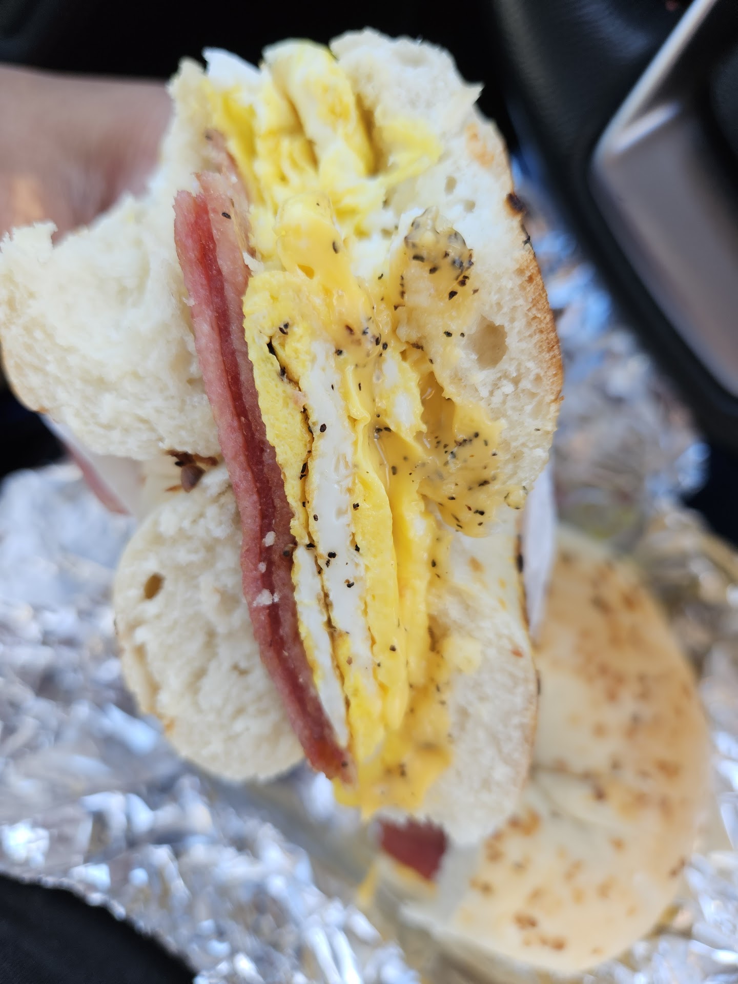 We were greeted with a friendly smile and assisted with our breakfast selection right away. They don't make their bagels here but they have close to about a dozen bagels on display. I got the taylor ham, egg, & cheese. I noticed the grill looked clean which is a huge plus! My sandwich came out perfect - not stingy at all with the taylor ham nor egg like they do at some places. The bagel, even though isn't made there, tastes fresh. My sandwich also wasn't dripping in oil unlike other places like the Bagel Pantry in Metuchen that recently closed sometime last year.