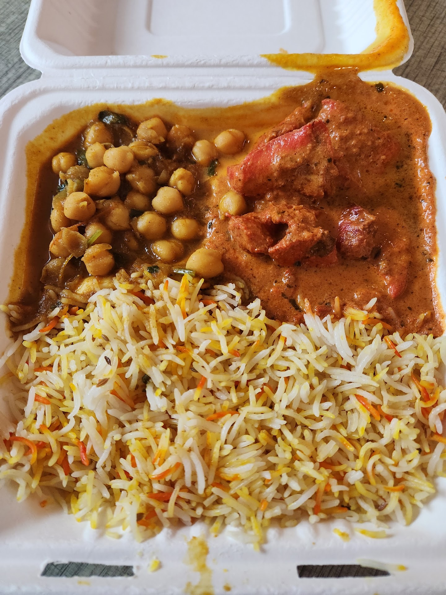We have been here twice. Each time I have gotten the Chicken combo platter. I get Chicken Tikki Masala, Basmati rice, and chickpeas. The portions get filled up in the box. I don't like having sauce coated on the basmati rice and will tell the server to have it away from it when it gets poured.