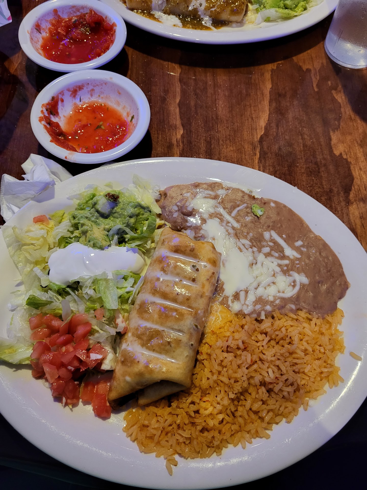 My son had the chimichanga with ground beef and cheese sauce. It is not deep fried like it's supposed to be so it was basically a burrito with watered cheese sauce. Like my enchilada experience, when he cut into it it just turned his plate into a soupy ground beef mess. He did like the refried beans and he ate the rice but mentioned it was rather bland.