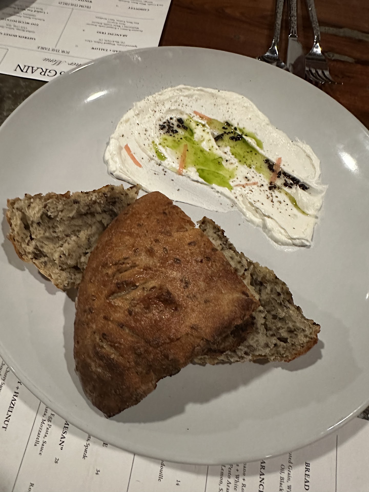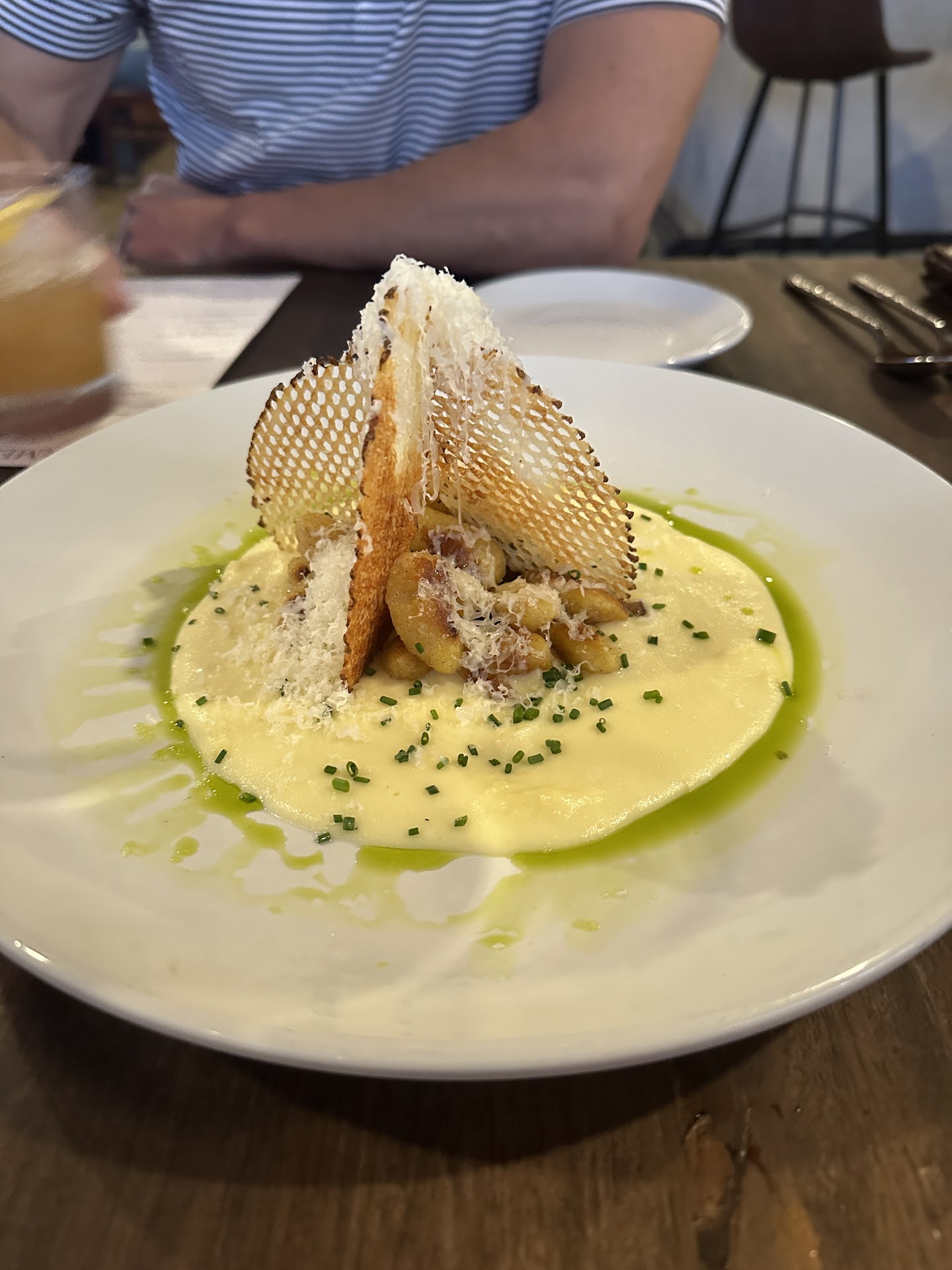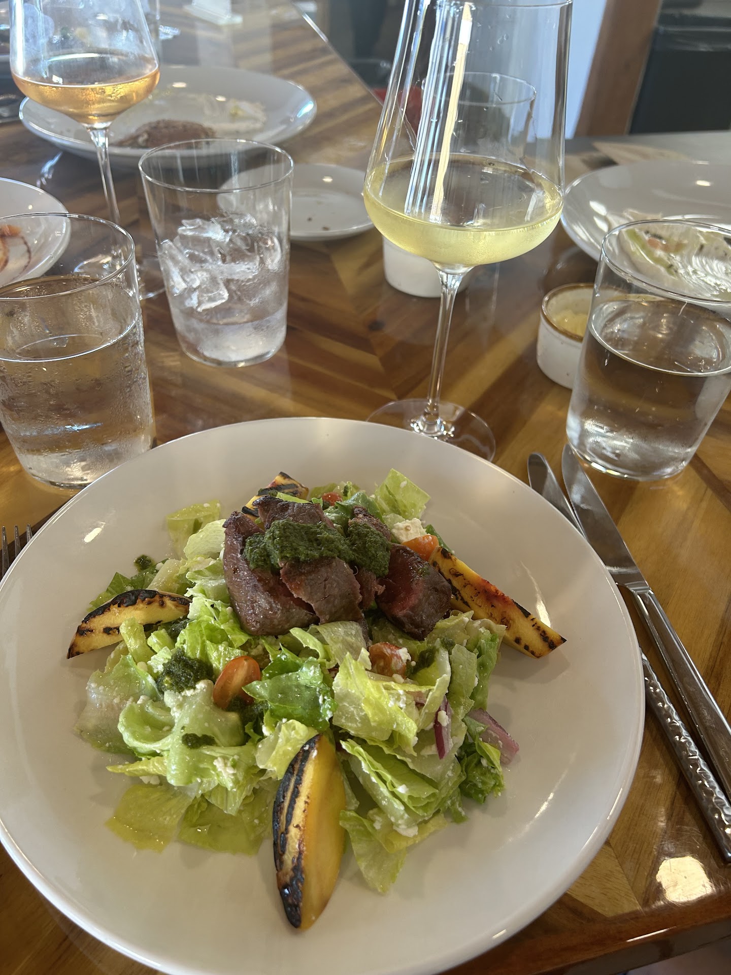Read moreWe have wanted to try this restaurant for the last year and finally made it! We had a babysitter and celebrating an anniversary. The cocktails and salmon appetizer was wonderful. I asked for us to share the peach salad with goat cheese and they split it on 2 plates (that they charged us $2 extra, a heads up would have been nice!) but it was a lot of arugula, and a small amount of a peach that you had to cut yourself, and about 1 tsp of goat cheese on each plate. We definitely felt $14 (actually spent $16) was overpriced for what we got. The dinners were amazing. I loved the salmon, the risotto was to die for, loved the peppers and cilantro, which added a nice contrast. My husband's steak was also good, but I didn't think it was as flavorful of a dish. We also asked for the peaches and cream dessert, which they did not split for us. Again overpriced. There was 1 peach cut in half with a little cream sauce and crumbled cookies; the cream was only on one side of this long dish which made it awkward for one of us to reach over half way across the table to partake of it. We were served it with 2 spoons which we assumed that meant the peaches were really tender but it was difficult to portion bite sizes with a spoon. So I requested forks and knives, which they brought 2 forks and 1 knife, apparently they didn't think we both needed a knife, so we each cut up our half of the peach into bite sized pieces; maybe the peaches are usually cooked more or the peach is more tender prior to cooking, not sure why a spoon would be recommended when you need to cut up a fruit that definitely is not tender enough for only a spoon. Also, I would have loved to try the bread plate but the price seemed very expensive, so we decided on salmon appetizer served on the bread. Overall the staff was really nice and generally informative, although not totally since we had the $2 surprise on the bill. We would like to try the restaurant again, but focus on the appetizer, meal and drinks (skip the...