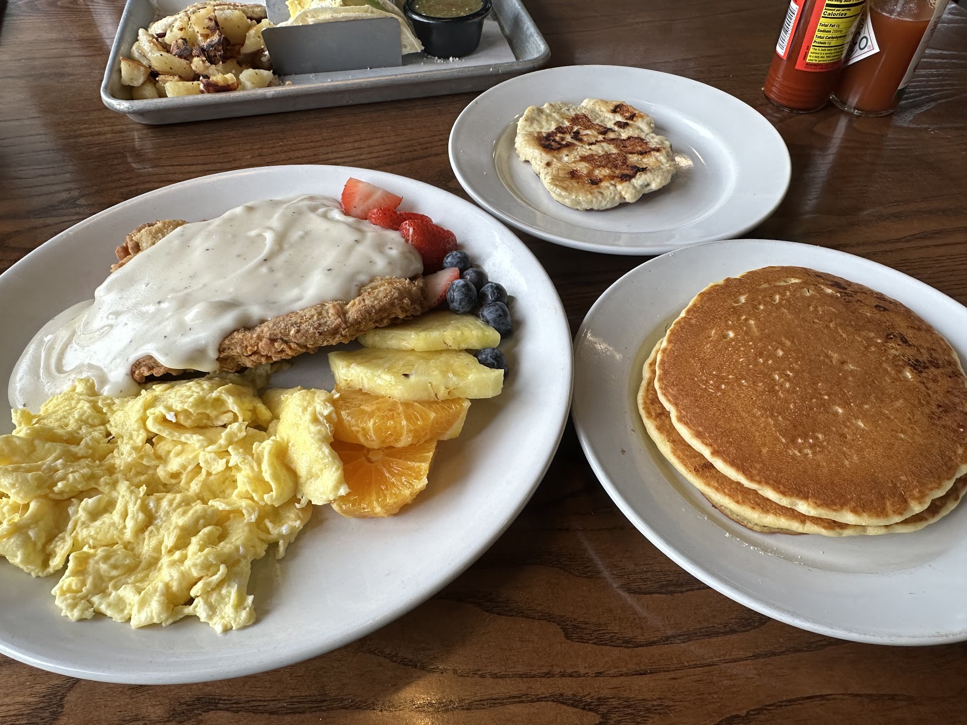 Once Jennifer did return, I ordered the Country Fried Steak and Gravy with Pancakes, Scrambled Eggs, Fruit and a side of Chicken Sausage. Now, I must say. The last few times I ordered country fried steak, I spoke of how tender they were. I didn't think it could be any more tender than the last time. I was wrong! This time is now the best time. It was O-SO TENDER! I didn't even need a steak knife to cut through it. The butter knife practically fell through it, piece by piece. It almost seemed as though it was precut. The scrambled eggs and fruit were delicious, and the pancakes, though not the fluffiest, were decent. I'd never eaten chicken sausage before today, but it was surprisingly quite tasty. I can't complain much about any of the food. It was, as they say, the breakfast of champions!