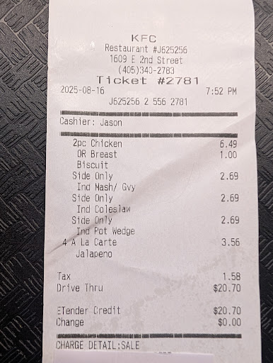 Ā Ā Ā Read moreI wish I could rate the food but I was not provided any service. On 07-29-2023 @ 3pm I entered the KFC off 2nd in Edmond near OU Hospital. I first went to the men's room to wash up then proceeded to the counter. Two employees were talking and sweeping up with their backs facing me talking loudly about personal items while another employee was sitting at the table 6 feet behind me playing on his phone. I waited at the counter for a couple minutes and no one acknowledged that I was there. The employee behind me looked up at me but never said a word, did not bother to get the others attention, or even acknowledge I was present. He also watched me as I left and still did not speak up to try and keep me in the restaurant. Very Dissatisfied and dissappointed with the service at this KFC. I guess that is why they had no one else there, no customers. Lots of chicken pre made but no one to feed it to. I hope management or the owners read this review. If you want to make money, you need to change the culture in that restaurant! I went to Taco Bell next door and got waited on instantly... HUGE difference.