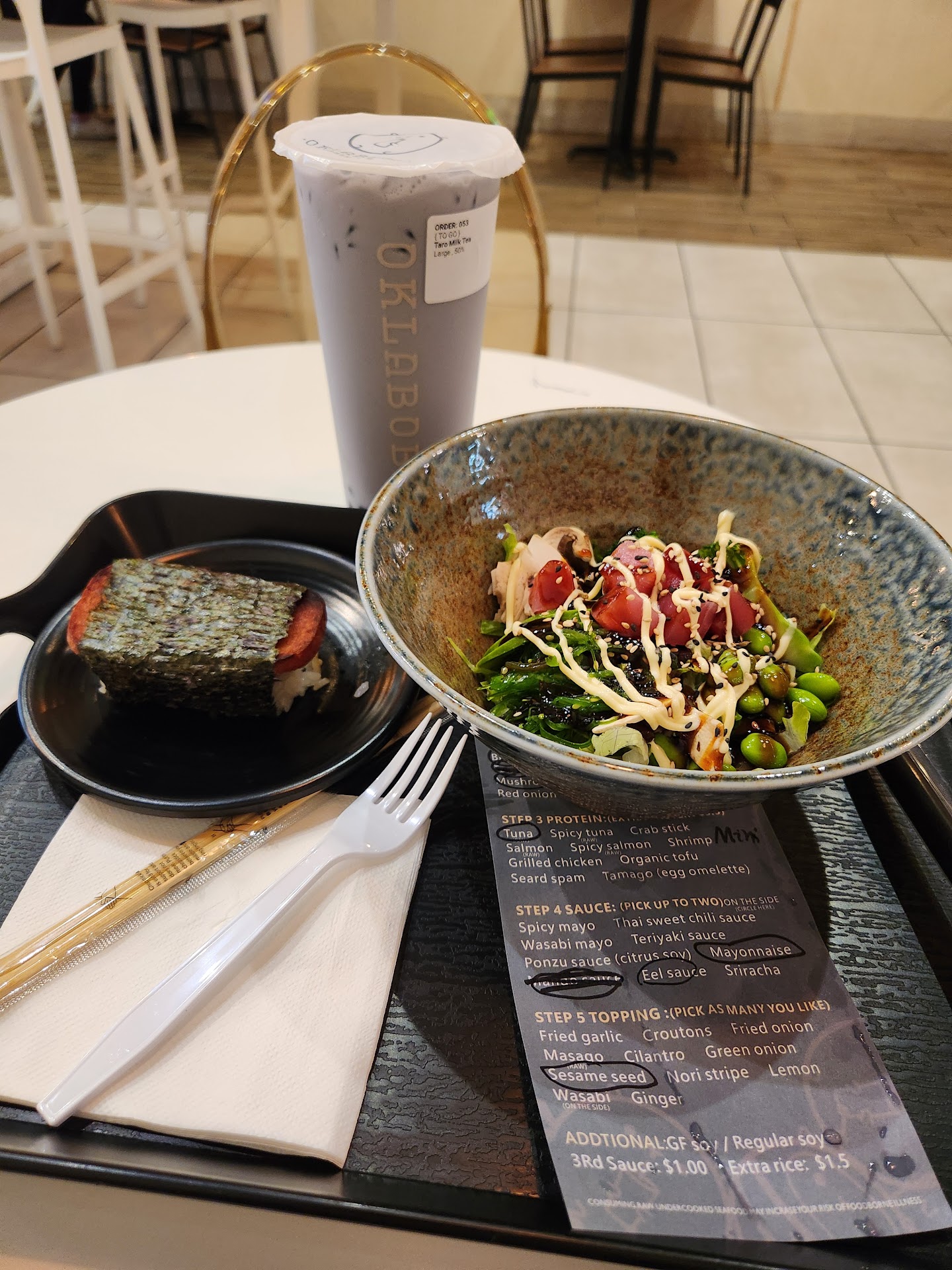 We were 2, 60- something, first time visitors open to something new and convenient in Edmond for late lunch. They have 5-step, circle your ingredients card, process. Prepare your brain 😆 for many order nuances ( e.g. 30/50/100 sweetness level of tea, light or heavy ice, type of milk, bowl or sushi burrito, i.e. seaweed wrap, etc ). My sushi burrito was delicious --loved my choices of wasabi mayo, red onion, salmon, white rice and avocado. Check the online info before you go if you like lots of time to consider all the options. Or grab a order card and sit down and study it before coming up to the counter. I liked the taro tea with coconut milk and 30. Very sweet even at that. Great flavor.