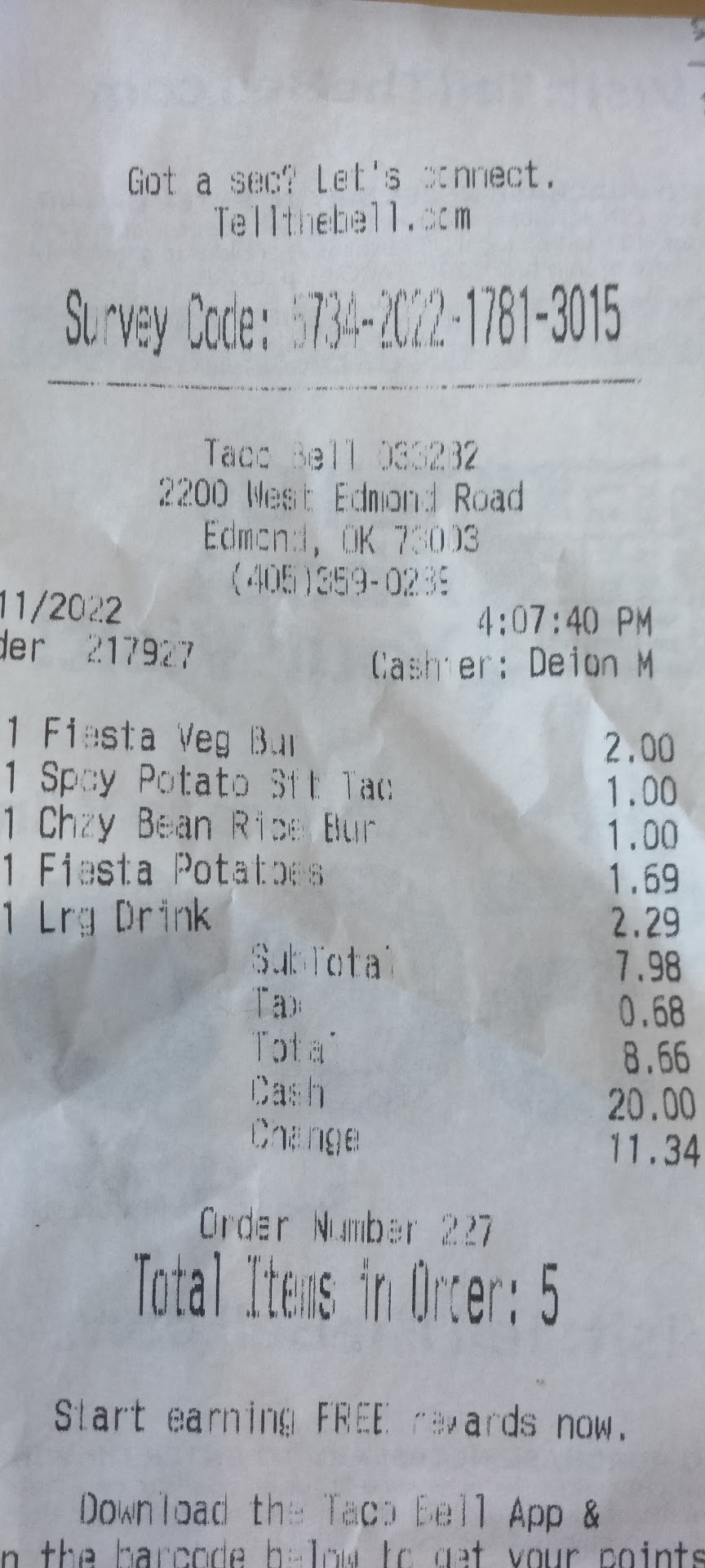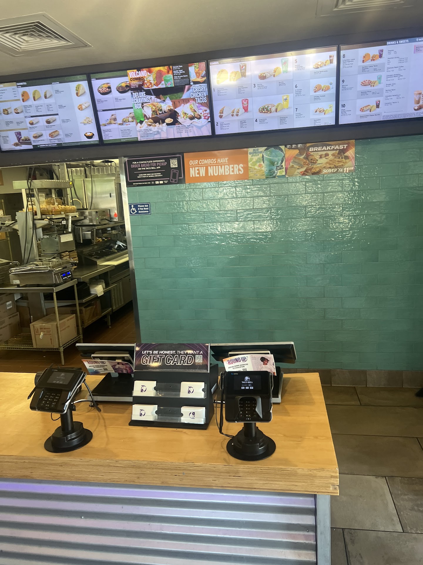 Okay so we dont normally eat takeout or eat fastfood but i really wanted cheap tacos🌮🌮 lol and fast so my amazing husband said okay you want taco bell lets go... i was excited yet thinking is this worth my waistline 😂.. ummm turns out it definitely wasn't 😡 okay Tacobell Restaurant Tacobell so he got the Carolina reaper fries🍟 and this was nothing like the picture or close i mean it looks like some one didnt Finnish them then they said hell we're gonna still sale them, i ordered the mini chicken quesadilla, hold up i olny get two tiny pieces of chicken i know its mini but damn you put the baby chicks in there!, im really gonna need them to do better because honestly this is crazy. As we ponder our decisions we looked at each other and said this is why we don't eat fastfood.🤦♀️🤦♂️ i wish i could...