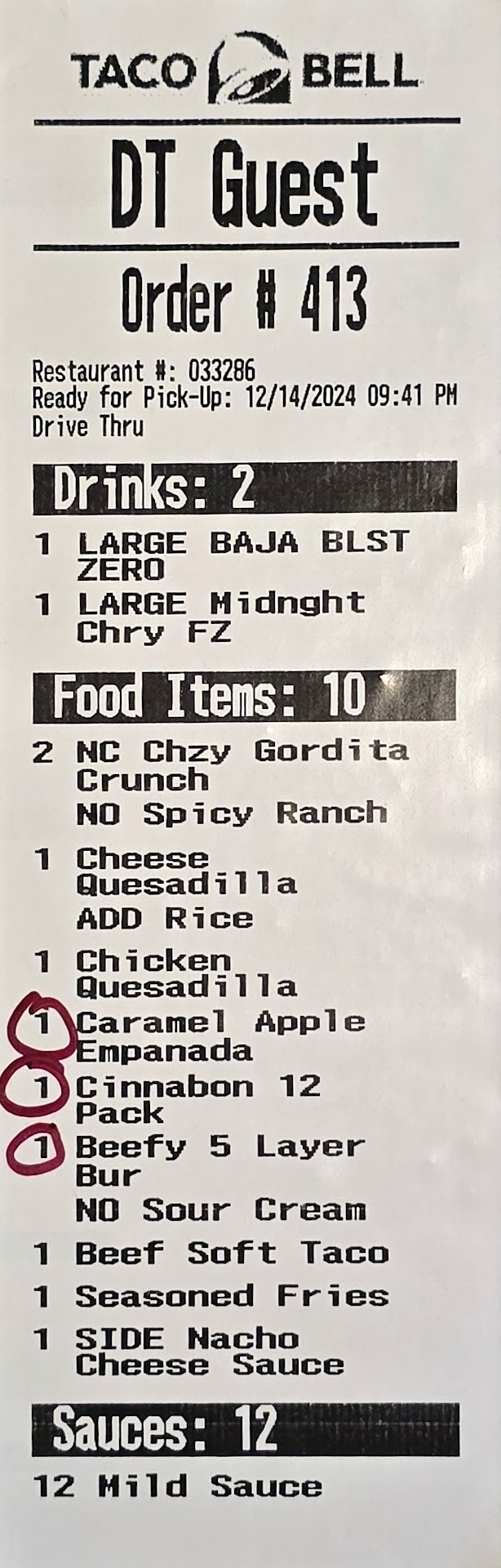 I mean it's Taco Bell. You normally don't eat here for good flavor, class, or as a treat. It's a eat in bulk type restaurant and Taco Bell knows that. Over the years they've taken away half decent tasting things and added more but amidst it all have maintained relatively the same price point and marketing. I truly appreciate that it is a place to eat and reminisce about being poor and only eating Taco Bell or having eating competitions with the guys. The reason for the 2 stars mainly is because of ingrediant quality and healthy options . I know it's a place for carbs and fat but being able to offset the bad choice of ordering 4 burritos with a nice fresh well made veggie taco or something would be wonderful. Plus service standards are not upheld across the numerous locations.