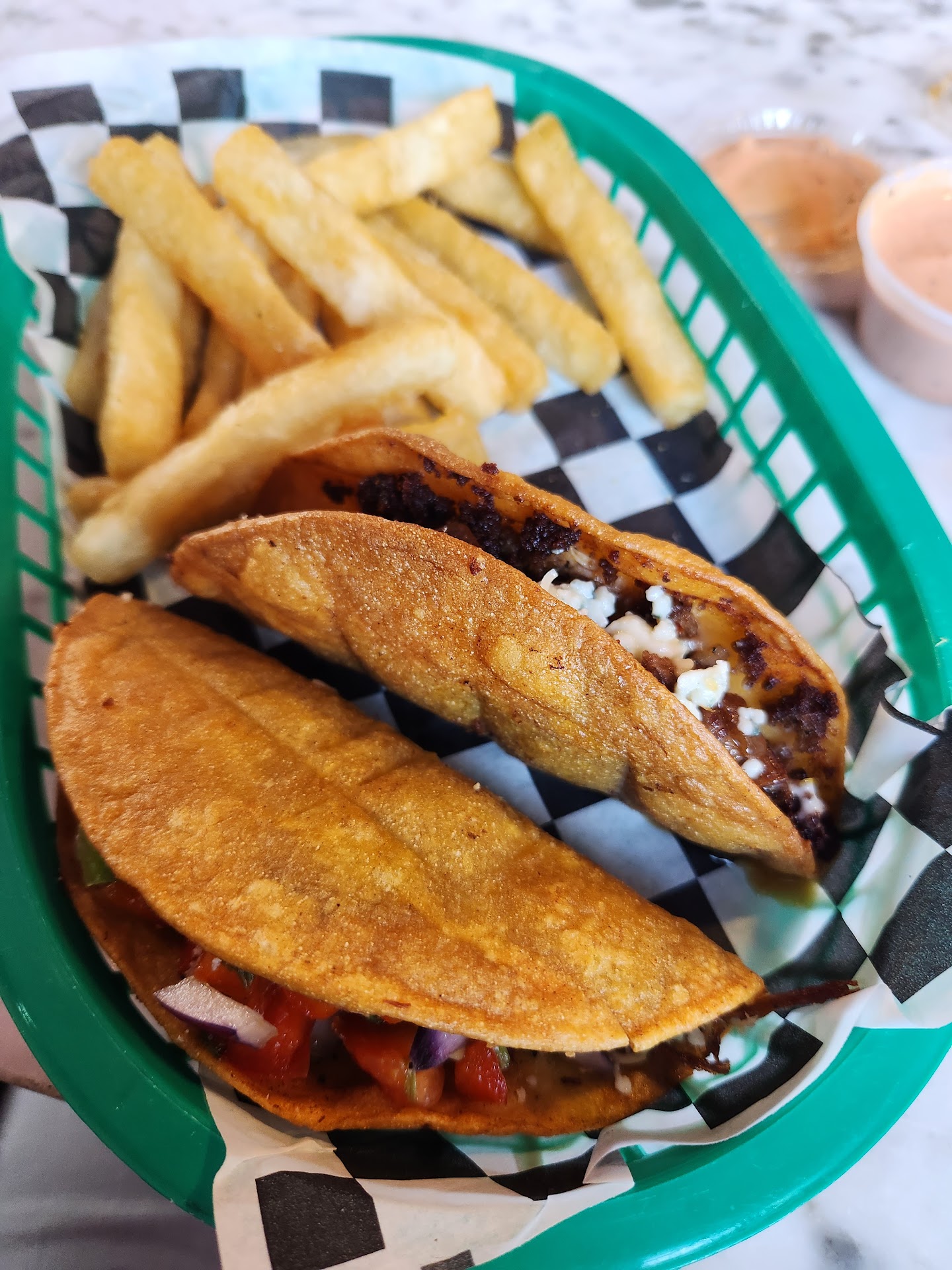 Read moreThe place is newer but it was surprisingly filthy. Every booth and table were soiled with dry food stains and crums. We couldn't find a table that wasn't filthy and had to sit on one of those filthy booths and put the food tray on one of those filthy tables. The staff all looked like they hadn't taken a shower in days nor had they brushed their teeth. The woman at the register touched our food right after handling other customers credit cards and being on the register. The food was terrible!!!! Mexican food is one of my favorite foods and this place managed to ruin tacos, queso, tortilla chips, and guacamole! Our whole order was vegan.The tacos were dripping with oil and barely had any feeling. The vegetable feeling was super low quality (barely any jackfruit, cabbage, and there were like 3 little pieces of shredded carrot in there), the guacamole was insanely salty, browned store-bought guacamole with some old browned real avocado mixed into it, with what looked like old frozen pieces of mango chunks. My goodness! How can they call that guacamole! Blasphemy!!! And the supposed "queso" was a white liquefied soup and insanely salty. The tortilla chips were just oil and salt to the point we only managed to eat a few. Here is the worst part though: even though we only ate our 2 tacos and only had a couple of bites of the guacamole and queso, and only ate like 5 tortilla chips, my husband and I got sick!!! I had acid reflux for the first time in years and he had diarrhea! Their hygiene is not there, and the quality of the food is so horrible! First time in our lives that we got sick after eating in an establishment anywhere in the world! Their prices are unacceptably high for such unacceptable food! Go instead to Oso in OKC! Oso's vegan tacos,vegan enchiladas, guacamole, salsas, and tortilla chips are incredible!