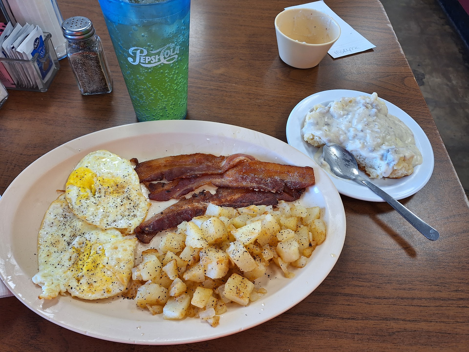 So, Virginia’s was a place recommended by someone local here in Edmond. You would almost have to be a local to eat here. I’m not even sure where to begin. It’s a seat yourself place with two waitresses. The tables are sticky and not in any particular order. We dined in on a Wednesday for lunch and the restaurant wasn’t super busy. While waiting for our food I was able to observe the kitchen and waitresses working. Jodie was our waitress and she took care of our needs. The other woman with the long hair was handling rolls and biscuits with her bare hands from fresh plates after cleaning tables and using the register. I waited for her to wash her hands and did not see it. This is my biggest complaint.