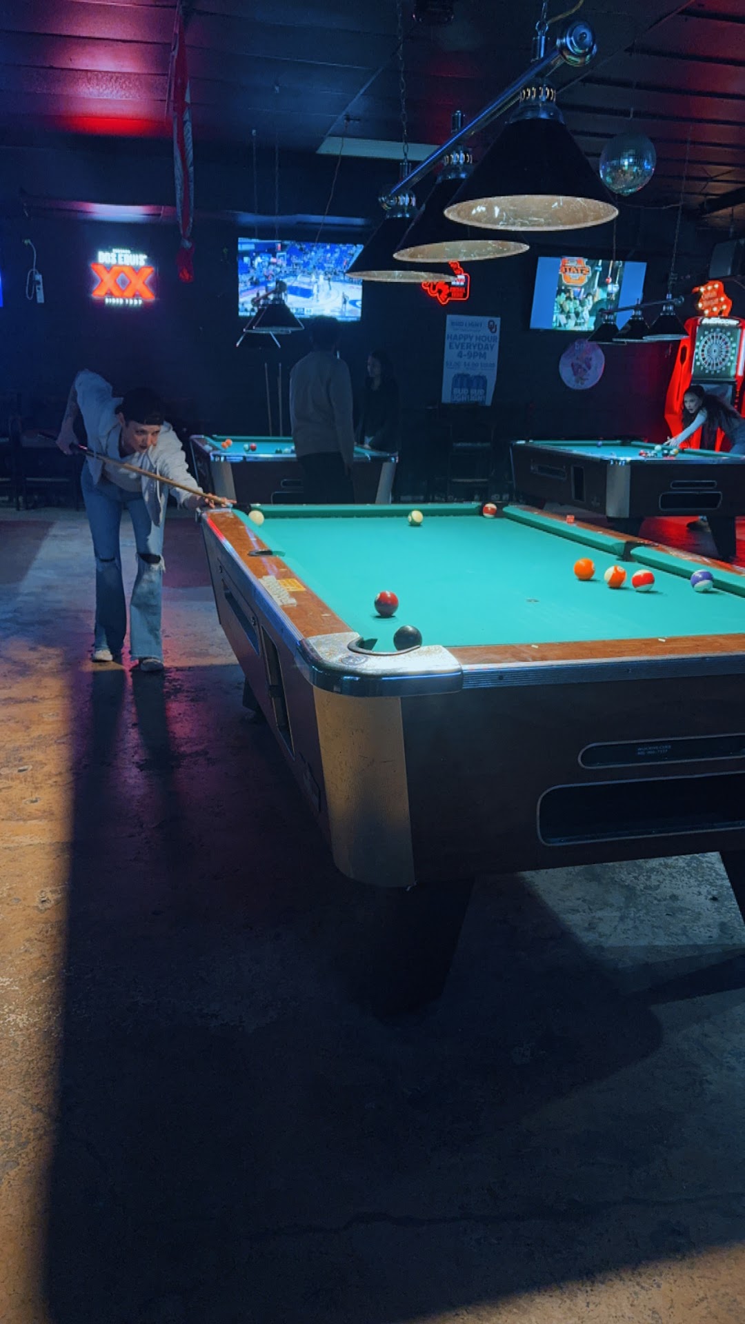 We're visiting from out of town. My father in law likes to play pool so we went to the bar. There are plenty of pool tables as well as other games. It's big and roomy. Prices were fair. My husband and father in law were running the pool table and having a good time. Various players tried to win the table. There were 3 people who wanted them to give up the table but my husband said they would have to win it. Apparently the woman in their group decided to go tell the bouncer and security lies. Instead of the bouncer and security coming to ask us what was going on, they came over and started accusing us of causing trouble. They were rude to us and it wasn't even true what she said. My husband took the bouncer over to the lady to confront her with what she said. Eventually the bouncer figured out what was going on. The problem I had was the way the bouncer and security handled it. They both just came over and started yelling at us. After the matter was settled, the security came over and told my sister in law and myself if we couldn't stop arguing with that group, we were going to be kicked out. I hadn't even spoken to those folks.I wasn't even playing pool and the only people I interacted with was the bartender and my family. I get that it's a bar but I don't think I've ever been treated that way. We left after that and we won't be back. We went out to have fun, not be yelled at and treated...