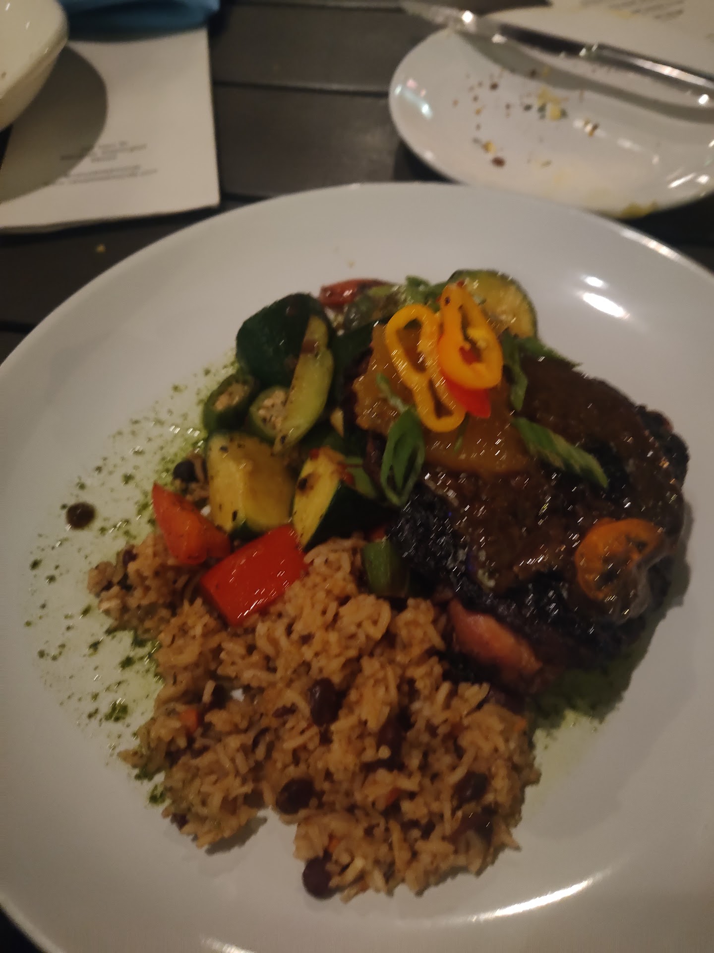 Lastly, I had the jerk chicken. It was delicious, It really was. But I'm a small person and I feel that it was too small of a portion for the price of $27 for one piece of chicken with bones in it. I was served about a tablespoon of beans and rice, which I mentioned to the server and then she brought some back in a little bowl. However after tasting it, Zatarain's beans and rice is about a thousand times better. This was some of the worst restaurant food (rice) I've ever had. If it's on the plate it should be edible that's the rule. Why would they serve this beans and rice?? I can't imagine serving it at any restaurant. It truly tasted as if it had been just sitting there all day, and it was served at room temp, no seasonings and dry.