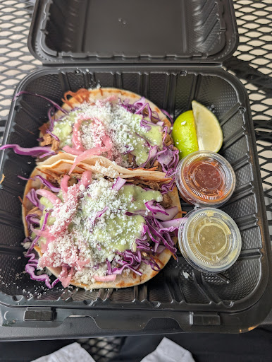 Read moreFirst time eating here today after driving by a few times. I got two of the pork tacos. The pulled pork was delicious and I thought they gave generous amounts. I initially thought $5 might be pricey for a "street taco" but once I saw the size I realized it was bigger than a typical street taco. I liked the juice from the lime slices that helped cut through the richness of the pulled pork. I'll definitely be back to try out other options on the menu. They say "no seats, just eats" but they do have a couple of two seater tables outside that I took advantage of....