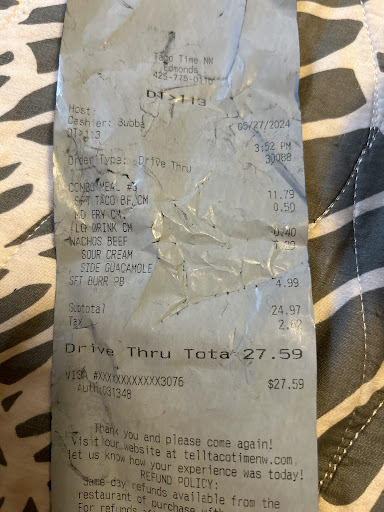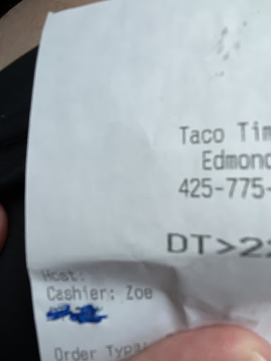 Ā Ā Ā Read moreI came in at 8pm. Ordered 2 hard tacos and a soft taco and a crusto. I specified fresh on the crusto since I was in a month ago and the crusto wasn't edible had turned to a brick, but served togo to me anyways. So this time I got home with my food and to my horror they had microwaved a old crusto from this morning and put tons and then tons more of cinn and sugar on the hot grease laddern chips, you couldn't see the chips they were so coated.I just couldn't understand why I didn't get fresh? Or at least told there are none. So I returned to the resturant, since phone calls go to a call center for Taco Time. I asked the same girl, didn't I say fresh and she said yes. I then got the manager who has no idea what customer service is. Of course I was mad. He could have cared less and stood buy the crustos that he said were made that morning. I guess he doesn't understand they are no good 10 hrs later. All I wanted was a little yummy dessert, my bad. Sheesh I've eaten here many times in 40 yrs. The last handful of times I didnt really like the food. I'm...
