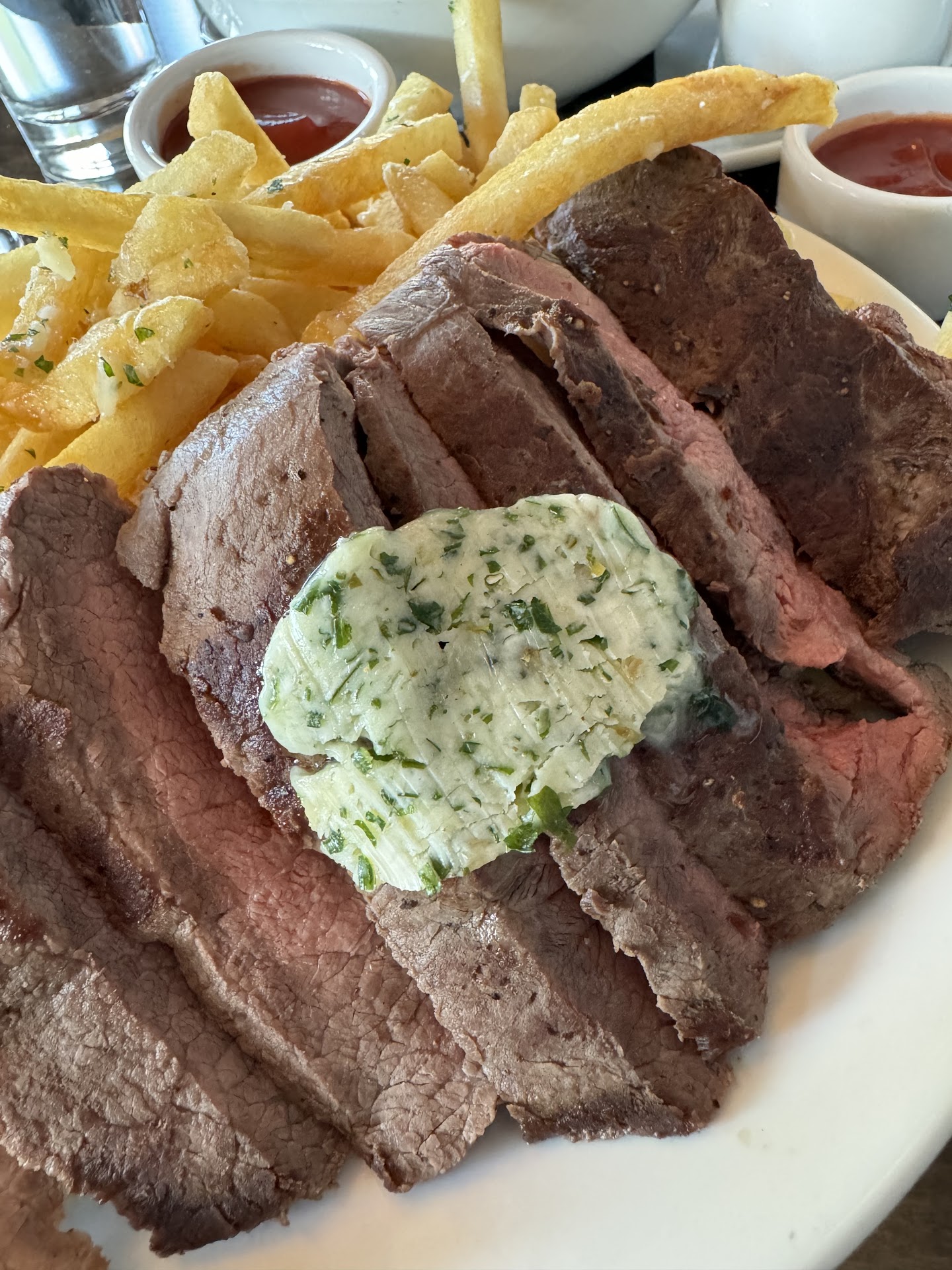 The rodeo burger was not that. I was served the bleu burger instead, and everything on the plate was as dry as cardboard. The bun was toasted but at least 3 days old - basically, compressed sawdust. The burger patty was dry as the bone off which the beef was carved. The bacon was crisped to the point of shattering. It was barely lukewarm, which meant the bleu cheese didn't melt. The fries were dry as a bale of hay and cold below the top layer that had been under the warming lamp while waiting for our waiter to serve us.
