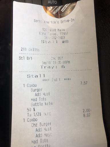 Read moreGood Morning Edna. How are you today? The most amazing thing happened yesterday, I was made aware via sign that Sonic Drive Thru was open for Breakfast. To my surprise they offer the Whole Menu of available ingredients even at 7:00 a.m. Thank You Sonic For Your Great Selections of Fresh Tasting Hot Dogs And Onions or Your Choice of Extra Good Sides. Then Later in The Day When Your Leaving The Airport on 59 South in Houston, Texas there is another Great Sonic that is becoming something like my second home because the Great Food and The Car Hops bringing your Order. Friendly and Intelligent Conversations....