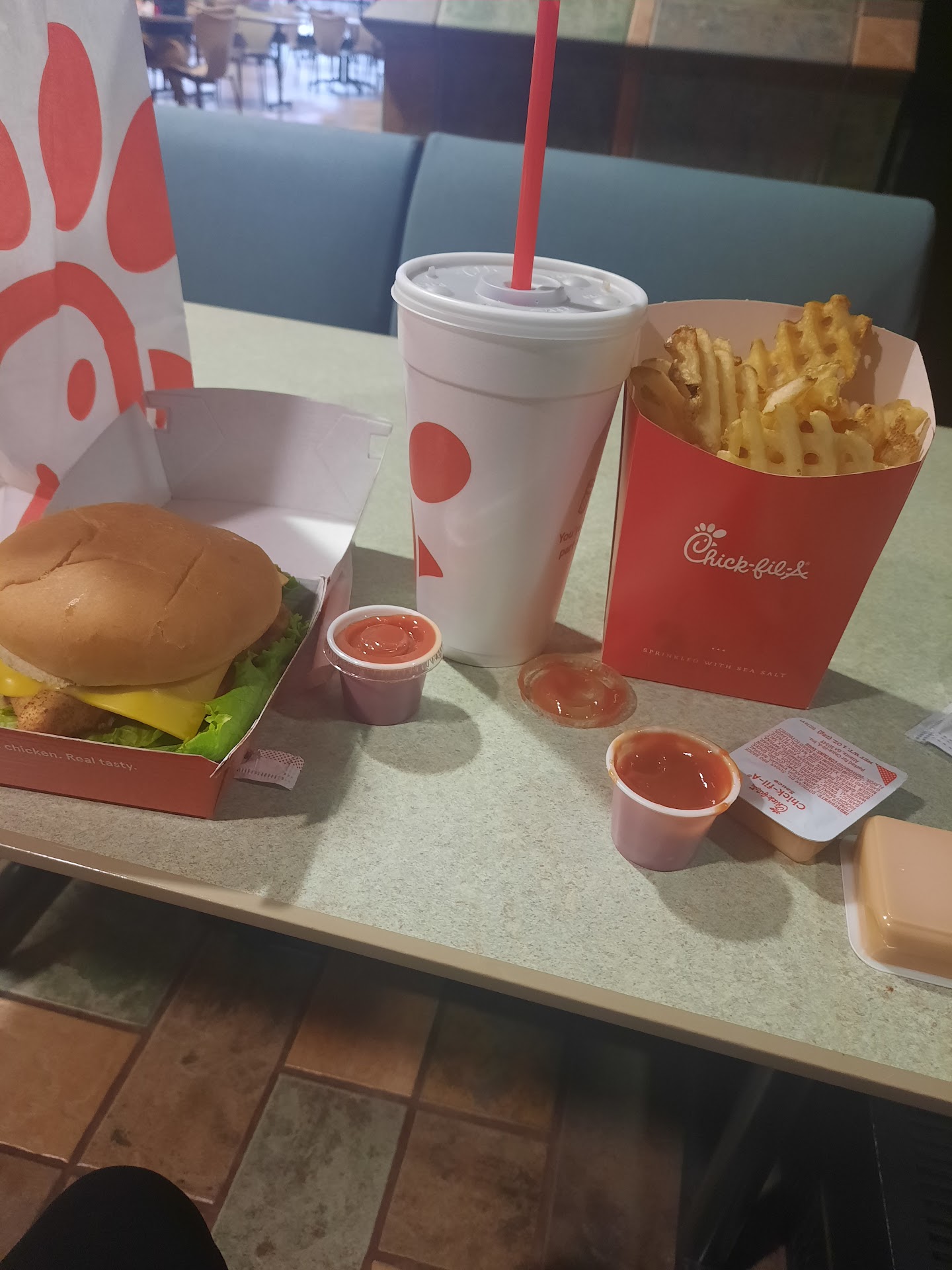 Read moreIf you could think of the worst possible location to put a chick fil a, this would be it. You cannot actively see the chick fil a from the street if you are new to the area, it is not a stand alone location but in a shopping center. You have to maneuver your way through the parking lot to get to the drive thru and at busy times is a bit chaotic. After the longest line and wait ever at a chick fil a, my order was indeed correct which was the best part of this visit. Everything else was...