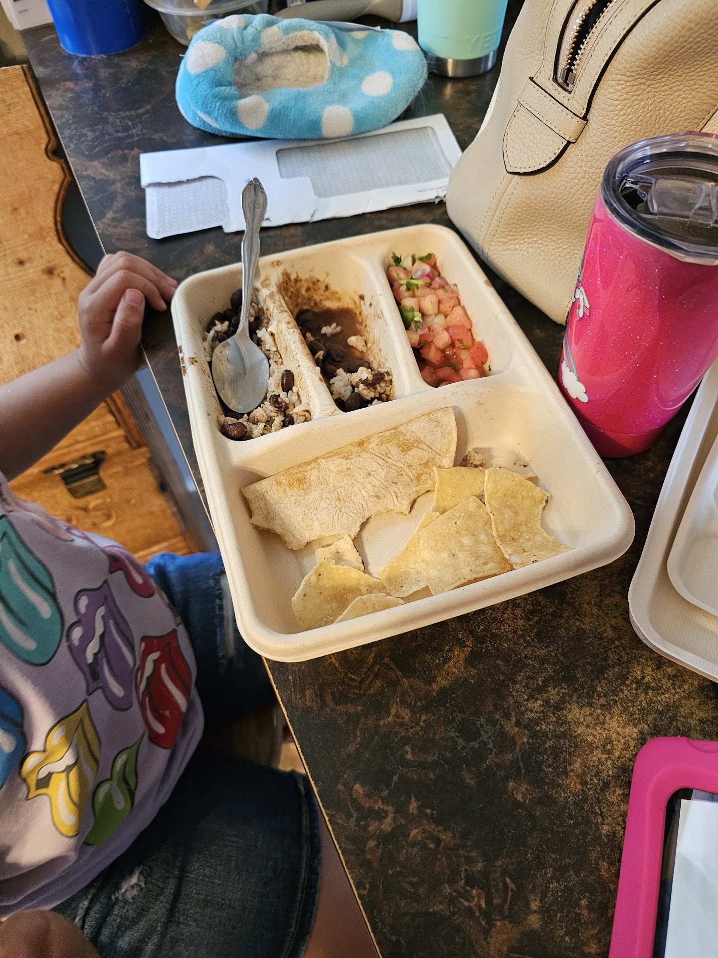 One kid got tortilla chips and the other got fresh fruit, which was an orange, but it was NOT fresh. My daughter bit into it and there was mold on the...