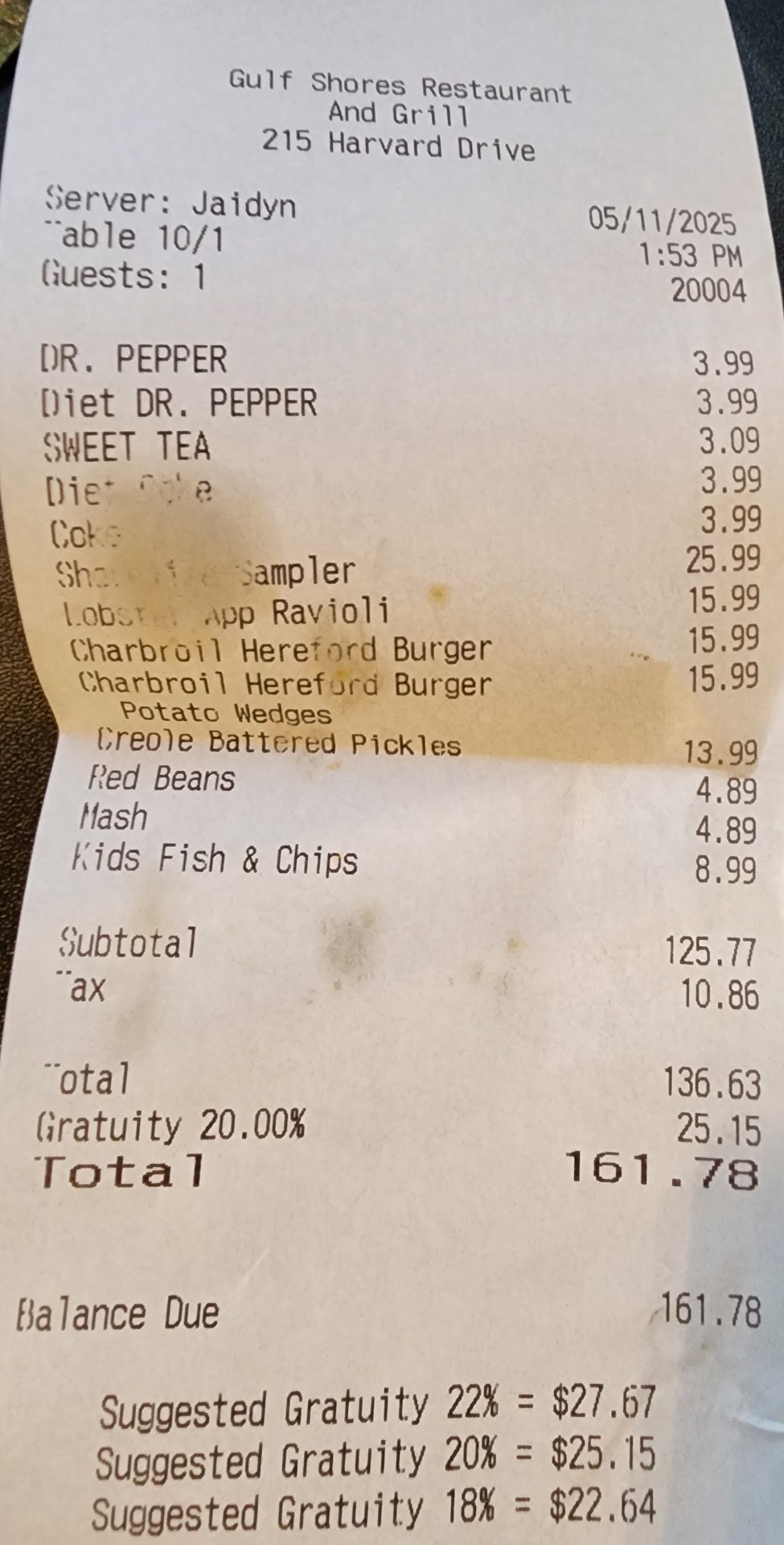 I can forgive all of this except the thing that got me was the very end when we received our bill, I didnāt check it for accuracy as the table behind us had been trying to get thereās fixed for quite a while from 2-3 different people. It was the forced added gratuity to a party of 5. The menu says 6. If you know the entire dining room is angry, and feel the need to automatically add gratuity to a table that doesnāt meet the 6+ Person requirement for it, chances are good you know youāve messed up.