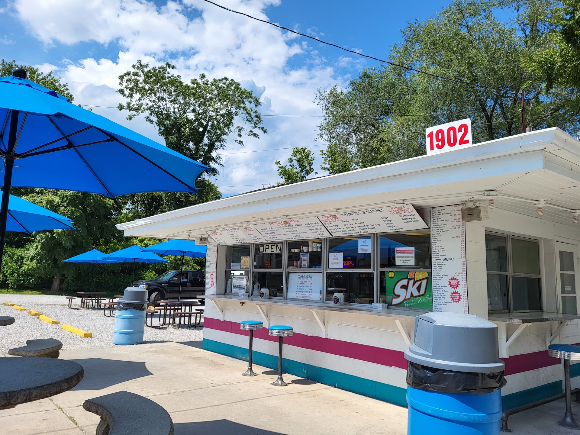 The ice cream is delicious with plenty of ways to eat it- shakes, concretes, all types of cones, with loads of mixers and flavor boosts. There's plenty of "bar food" to choose from as well. They carry some harder to find food items like fried okra & a pizza burger. They have burgers, sliders, a specialty charco burger, coney dogs, grilled ham & cheese, a few different fries, onion rings, and since new ownership, a pork steak platter special. Service is delightful but have some patience everything is made to order but does not take an excessive amount of time. Drive thru moves fast- walk up is always available. There are several picnic tables for sitting outside. Bring cash or expect a fifty-cent charge for using your debit/credit card. An...