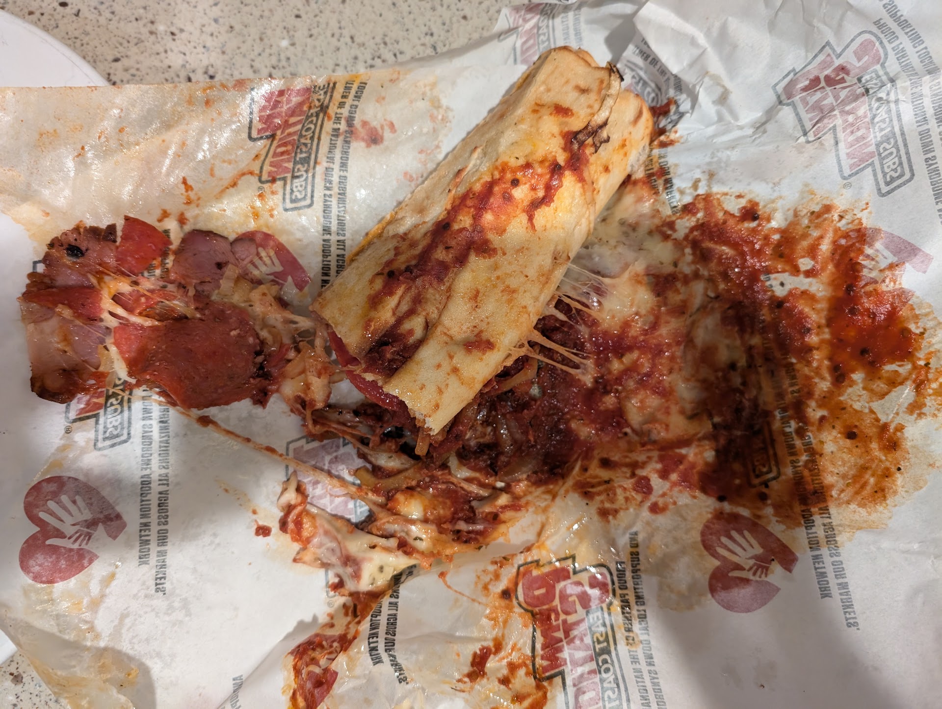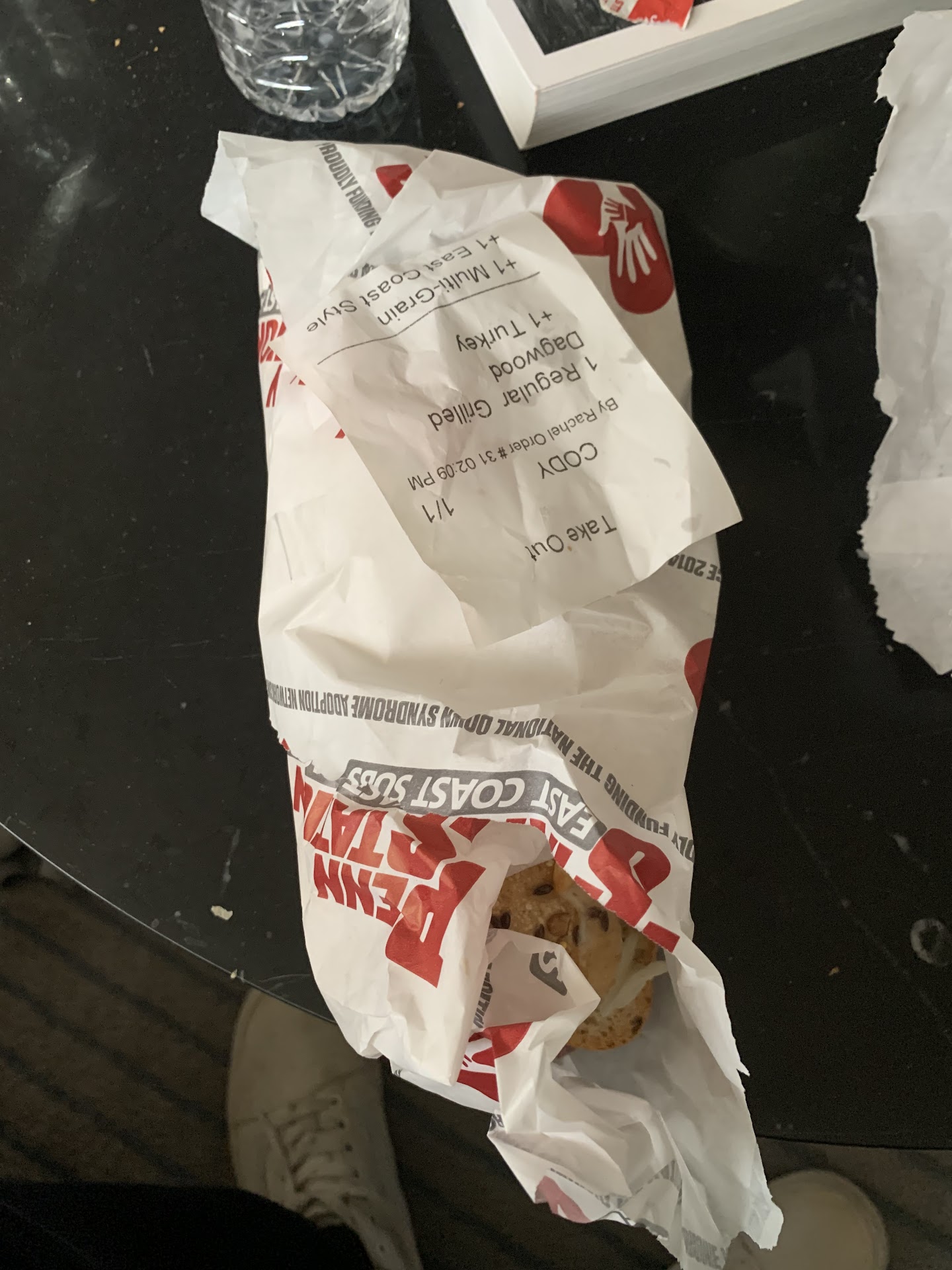 Last but not least, she couldnāt wrap my sandwich properly. Used several pieces of tape and threw it into the bag.