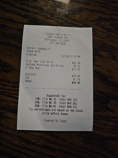 Read moreAbsolutely great food and service. The cheese sticks were amazing. Completely home made. Not the small frozen cheese sticks you get from most places. When they brought out the cheese sticks, I thought it was the fish I ordered they were so big. The walleye was beer battered, delicious, and flaky. The other day, I ordered the New york strip. It came out cooked perfectly, medium rare. It was one of the best steaks I've had in a while. The service was great, friendly, and attentive. I downed my sweet tea. Before I could ask, she brought me another. I was extremely thirsty and downed that one. Without asking, the waitress brought me 2 sweet teas to quinch my thirst. The only possible complaint I could have is the noisy atmosphere, but it is a bar, so you can't really penalize for that. The staff were all friendly and seemed to enjoy being there. A sentiment you don't see in the food industry much anymore. I would highly recommend Chasers to anyone looking for a great bar and grill while in the Effingham Illinois area. You...