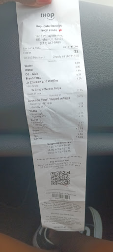 Read more2 stars because the food was good and Mom enjoyed it. We got sat on the side with a great view of the kitchen/order up window. Mozzarella sticks ok, but salty. Saw our order up over 7 minutes. During this time after asking waitress if that was our order, she said they don't like us to take them out early. Next time I asked she said other folks order my same dish. A few minutes later she said she would check on it. It was our order, just waiting for the side of 3 pancakes, said they had a new cook. Wait on pancakes at IHOP??? Food was delivered but still waited a few more minutes for our 3 pancakes, but only receiving 2. During this time of watching our food in the warmer, another waitress asked the cook if he was from St. Louis. He said no and that she was wanting to see if she could make her âarchâ. This continued with occasional âf bombsâ, and purposeful gagging sounds, all within 2 feet of our food. Yaâll need a better manager or a parent to help you grow up. I know they're new, but the is clearly ridiculous and...