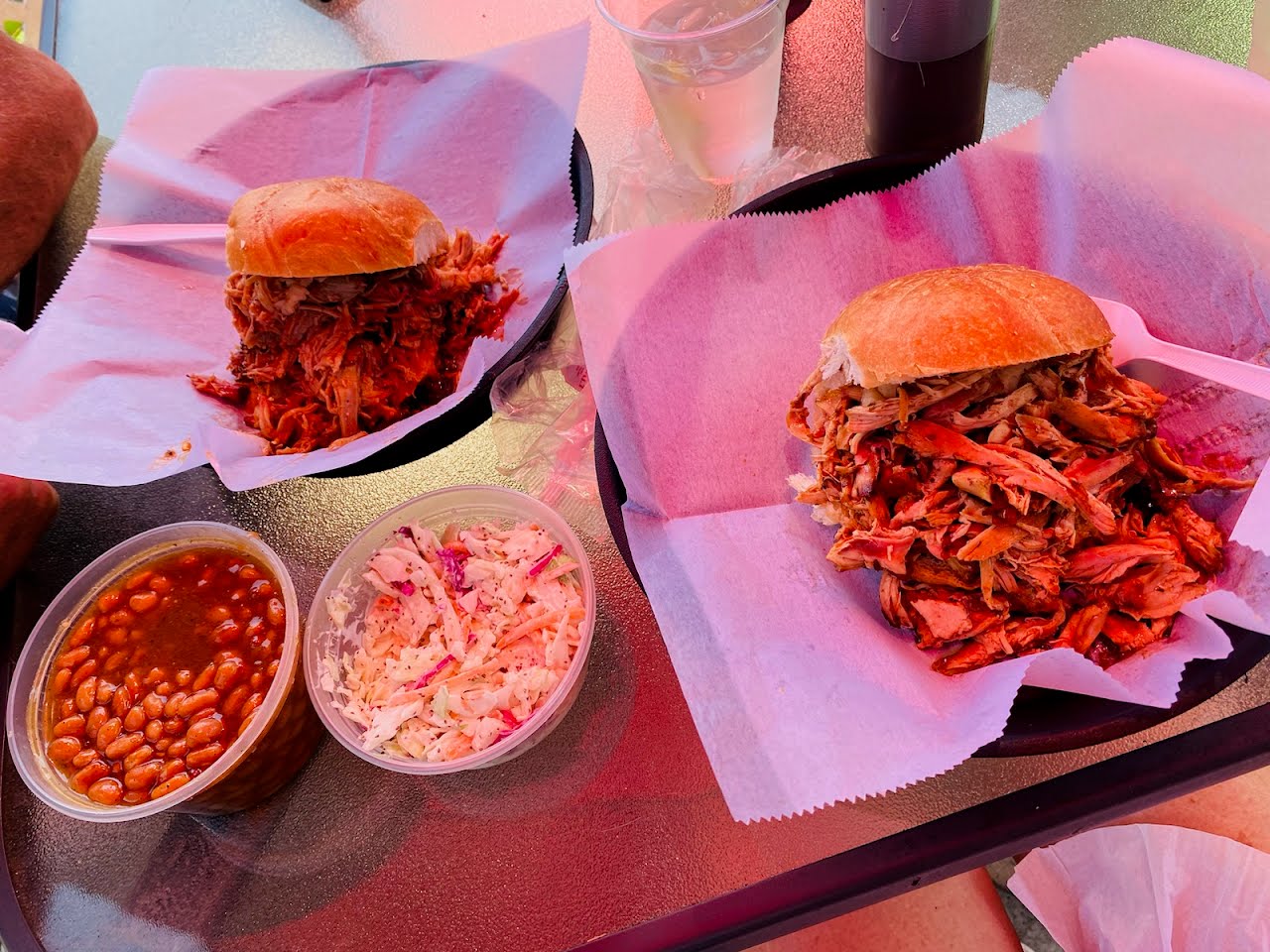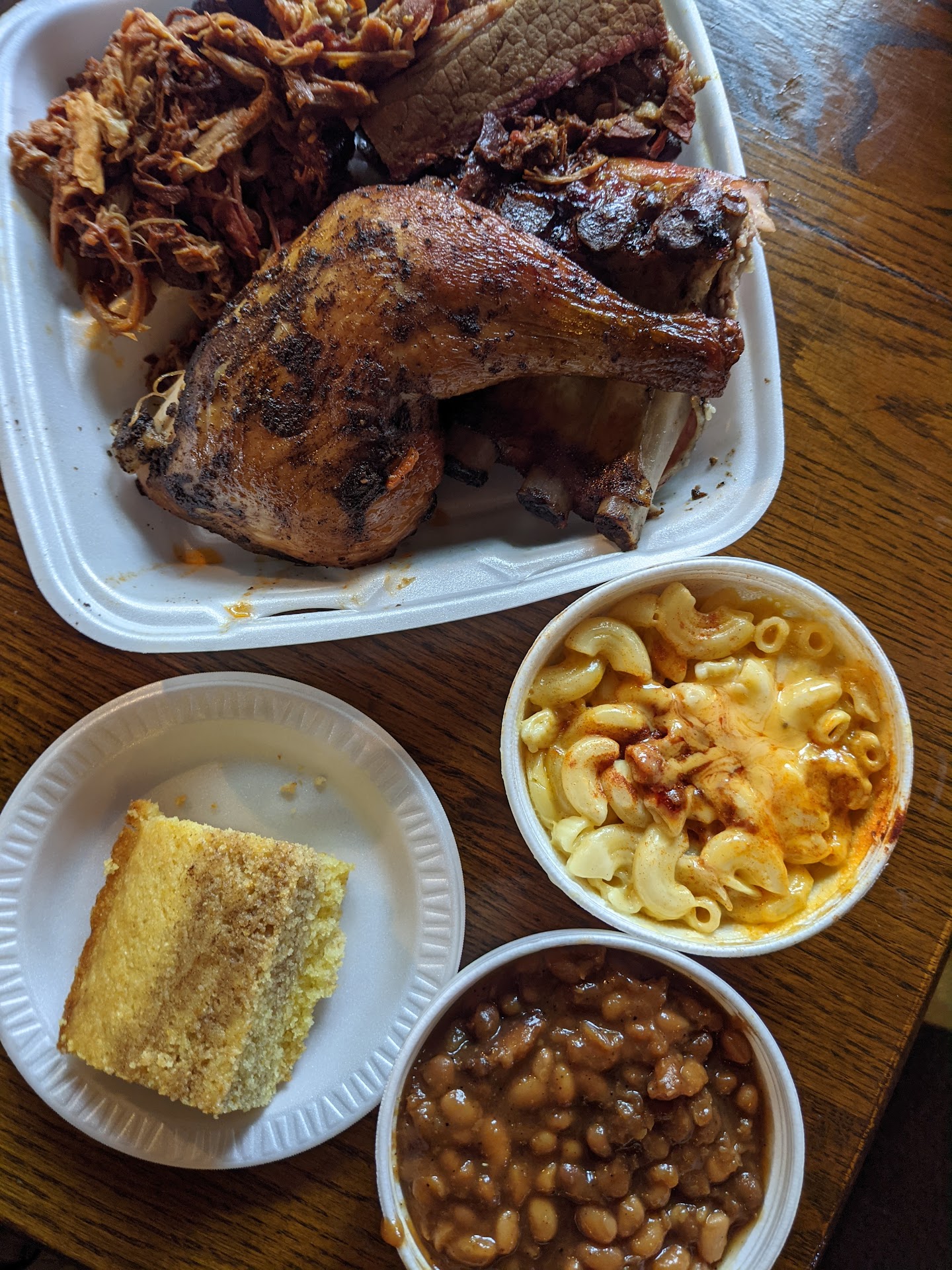 To start with the good, the pulled pork and the chicken were my favorite. The pork was swimming in sauce and juices and was very flavorful. The chicken was not dry and had good flavor as well. The ribs were good and you can pull the bone right off the meat which is always a good sign. The baked beans were good and came with a lot as a side so there was plenty to share. I also really like their onion rings as it's my style with a light but crispy breading and thin onion. I really liked their cornbread as it had a nice sweetness to it and was a nice size. Their barbeque sauce that they have was tasty and complemented the food well. They even have a spicy bbq that they offer and it burned my mouth but not terribly so that's a win for me.