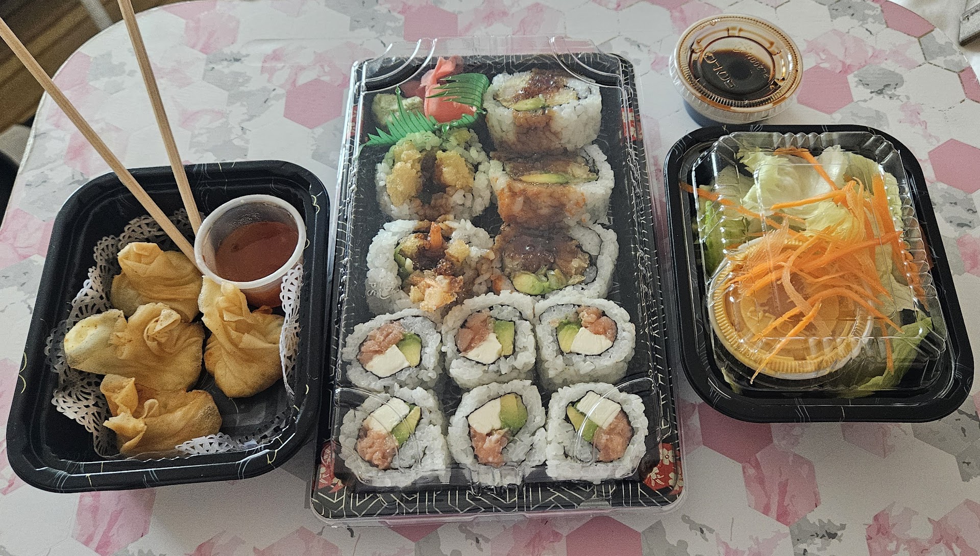 I had come here Saturday 6/15/2024 and in my mind I had it being as a huge restaurant. It's a small hole in the wall of a restaurant. The atmosphere is very nice and calm. There is seating with tables and just seating with chairs. A Vending machine and the sweetest people I have met. I do not live in the area and wanted sushi for my aunts birthday and highly enjoyed myself. The little kid who was 4 was an absolute pleasure. He was the sweetest and kept us company while we waited for our food. I enjoyed the food very much. The shrimp and cream cheese dumplings are small but absolutely delicious. I only like cooked sushi nothing raw and I ordered the Pilly which was the smoked salmon and cream cheese with avocado. I also ordered the cucumber and shrimp rolls and they were amazing. I never had seaweed salad before and it was delicious as well. My aunt pretty much ordered the same except she ordered eel on her sushi roll.