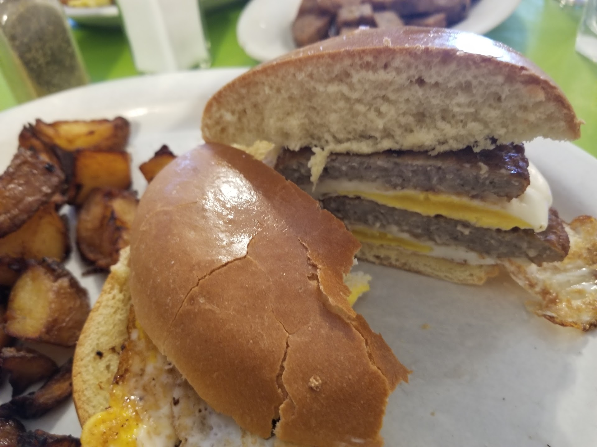 The food, portions and prices were quite good but overall not so good. I came with my friend who grew up near here and used to frequent the cafe many years ago. It's nothing special in terms of atmosphere and location and it's irritating that here, as with so many other restaurants, has giant tv's blaring sports...sports AND background music. Why can't we get the option of none of that or keep the noise in one room and quiet in the other, but to have tv and music in both rooms? Coffee was good, the breakfast menu was extensive, very reasonable and every day many specials are offered which is a real plus, especially for a small place. My friend's meal of blintzes, was served quickly and she liked it but all I got was toast which got cold while waiting.....and waiting for my meal. A group of four sat down next to us, got served way before my meal came...and I waited and waited...and the toast got cold. Finally after the people at the other table were enjoying their meal and my friend had finished her meal...mine finally came after I asked why they who arrived long after us had already been served. The waitress finally said "Yours will be out in a minute" but no apology or explanation. I got a big tasty Spanish omelet, albeit cooked a little too runny for my liking, but it was good--and the portion was huge with a huge serving of home fries--some of which were blackened and overcooked, but the waitress did bring me new toast. Yay. Strange--is not it? It seemed that they deliberately held up my order. Nobody explained anything, nobody apologized, nobody offered to make it up in any way. Even with big portions and reasonably good and well-priced food, I won't go back. I really don't care for the big screen sports and background noise and the bathroom could have been a lot cleaner. A restaurant can always get backed up and I can understand, but they did not seem short-staffed and other guests got served before me. Come on--if a customer is made to wait and wait--especially in light of the other circumstances described above--offer to make it up to the customer! Some way! Any way and It could have been made much more pleasant, but when I saw a waitress sneeze just outside the kitchen without covering her mouth or going to wash her face and hands I should probably have left. Thus 4 stars for food even with the burnt potatoes and 1 and 2 stars for everything else. It could easily have been four stars for everything had they been more...