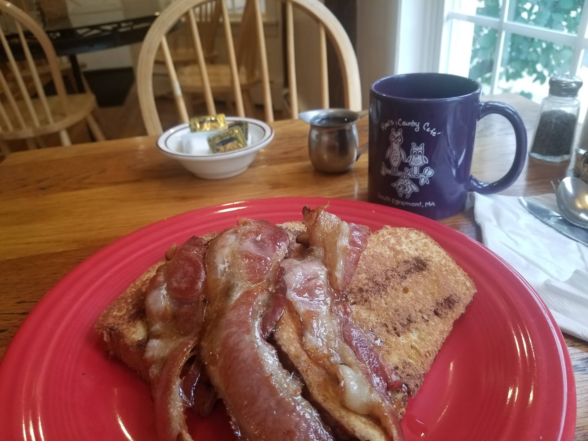 Read moreWhat a fantastic breakfast and setting. I, and 3 companions, ate out on the deck and were delightfully surprised that we were immediately adjacent to a large stream. And the food was fantastic. We had coffee, pancakes, eggs, home fries, ham steak, sausage, OJ, etc. The pancakes are genuine buttermilk and are large and delicious. The home fries have that perfect combo of seasoning, slightly crunchy, and perfectly cooked. Eggs were prepared exactly as asked. The service was great, we had two servers tend to us and they were both very attentive, even with a good crowd dining both indoors and outdoors. The only 'meh' was the regular OJ, the fresh squeezed is...
