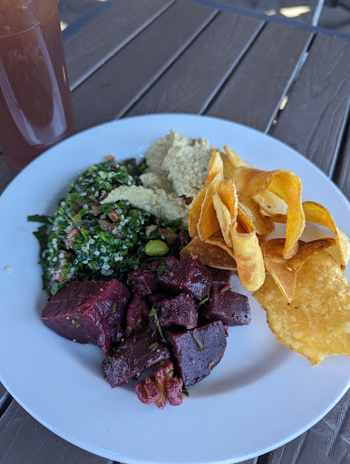 The food order came to the table pretty quickly after we ordered. We opted to sit outside since it wasn't as noisy and to enjoy the beautiful weather. The owner came by with a complimentary plate of their cilantro hummus, tabbouleh, a roasted beets side, and their house potato chips. We each ordered different salads with added protein (seared Ahi, Tuscan salmon, and Grass feed steaks). Their iced tea, carrot orange juice refreshers, and giant cookies were good too. Everything was delicious!