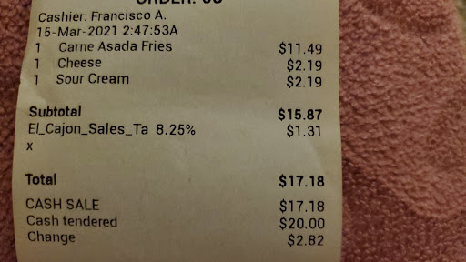 Read moreFirst of all no veggie burrito. I ordered a bean and cheese burrito,add lettuce, guacamole, rice and fries,with a side of hot carrots,and small Jamaica. My total was 15$. Nice birthday lunch,or so I thought. After arriving back at my jobsite, I notice no hot carrots nor rice in the burrito. I called and the same lady who took my ordered,answered, she already knew they forgot to add my rice and offered a side of rice, but I only had 15 minutes to claim this. I also said there were no hot carrots in the bag, and she wants to argue that she put them in the bag, after a couple of times going back and forth, I said you know what keep it, forget about it, I'll just write you a nice review,...