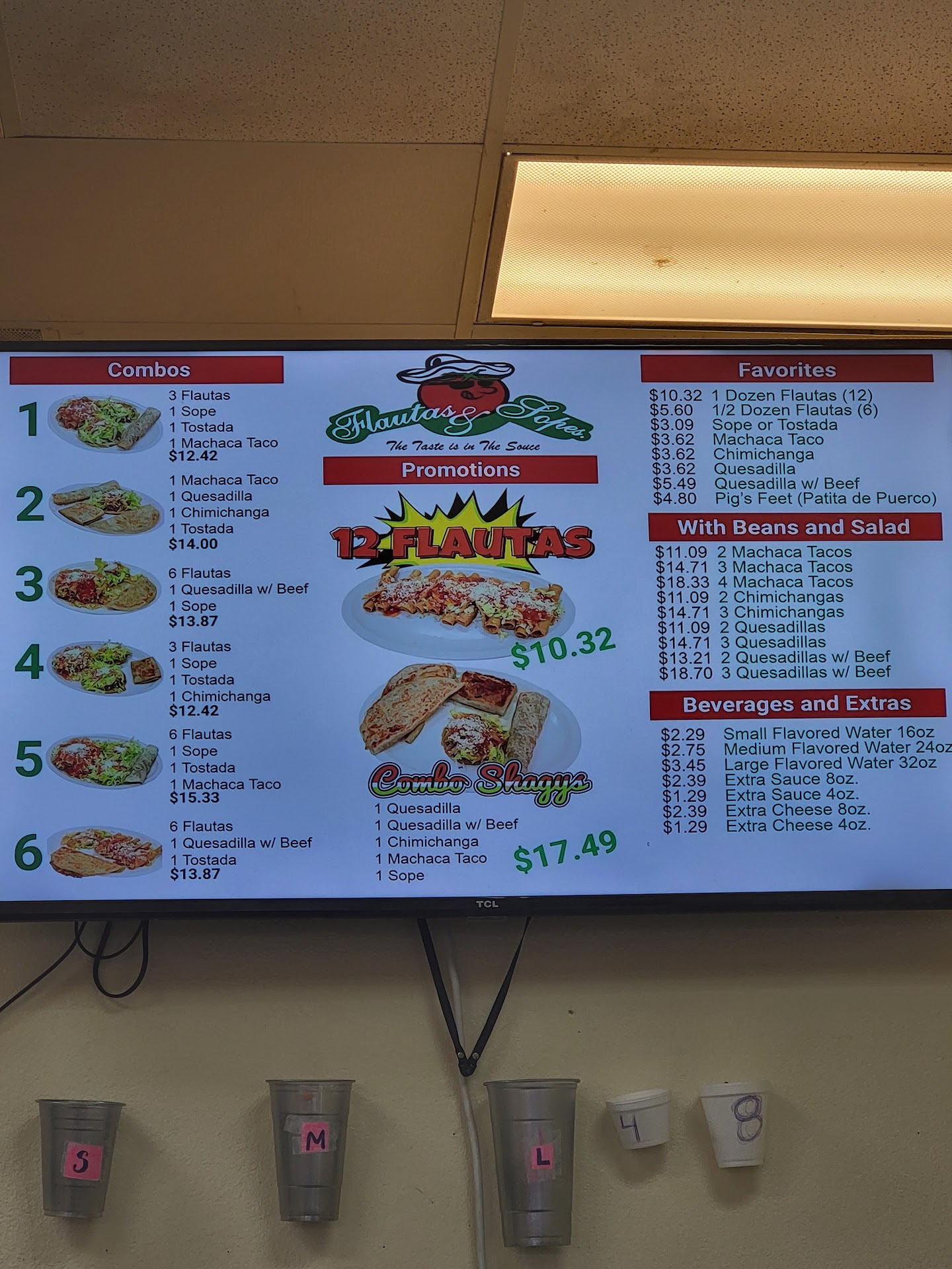 We stopped on our way home to Arizona from San Diego. The flautas, tostadas , quesadillas and sopes are good. The flautas are not your traditional potato flautas. They are beef rolled tacos smothered with lettuce/cabbage and hot sauce. Most people prefer to add hot sauce to their liking. They do not out enough meat in the rolled taco. The little meat that they do Put in them is in the middle third of the taco. End are meatless. There are no napkins at the tables. You have to ask for napkins. When you do ask for some, they give you a couple. The fountain drinks are out for the public, but you have to ask for a refill. I did not like the fact that we had to ask for napkins and drinks. Those should be accessible to the customer at will. I do not think that I would eat here again. Too pricy for the little, barely meat on them,...