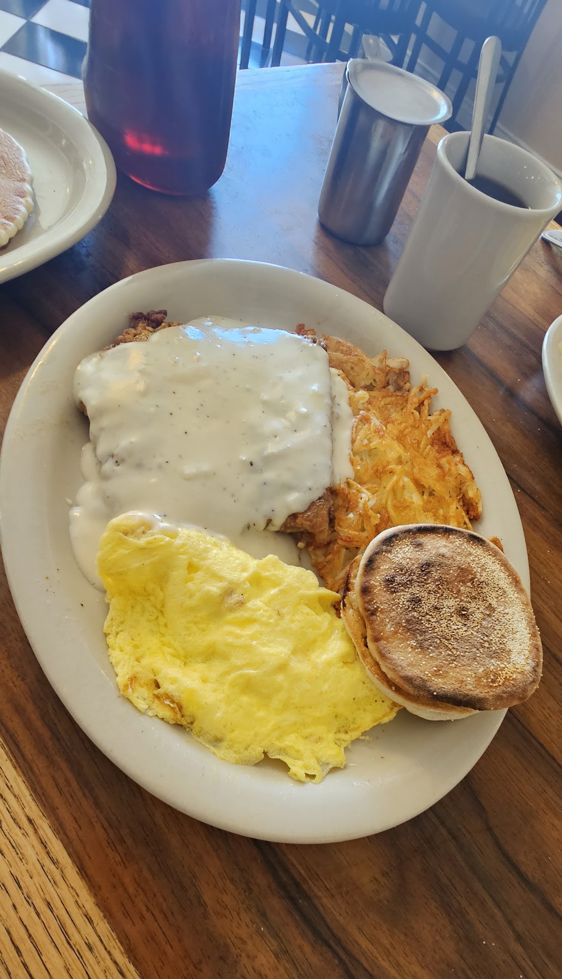 I'm a big fan of chicken fried steak and eggs. This place did an awesome job making the dish. The chicken fried steak was prepared fresh and was topped with white country gravy. I chose hash browns over the other options available. For my toast option I chose the English muffin; buttered of course. I also ordered one single pancake not knowing how much food would be served. The portions are large, tasty and filling. I ordered ice tea for my beverage. One thing I liked was that they provide a carafe of additional iced tea to pour your own refills. Total review:...